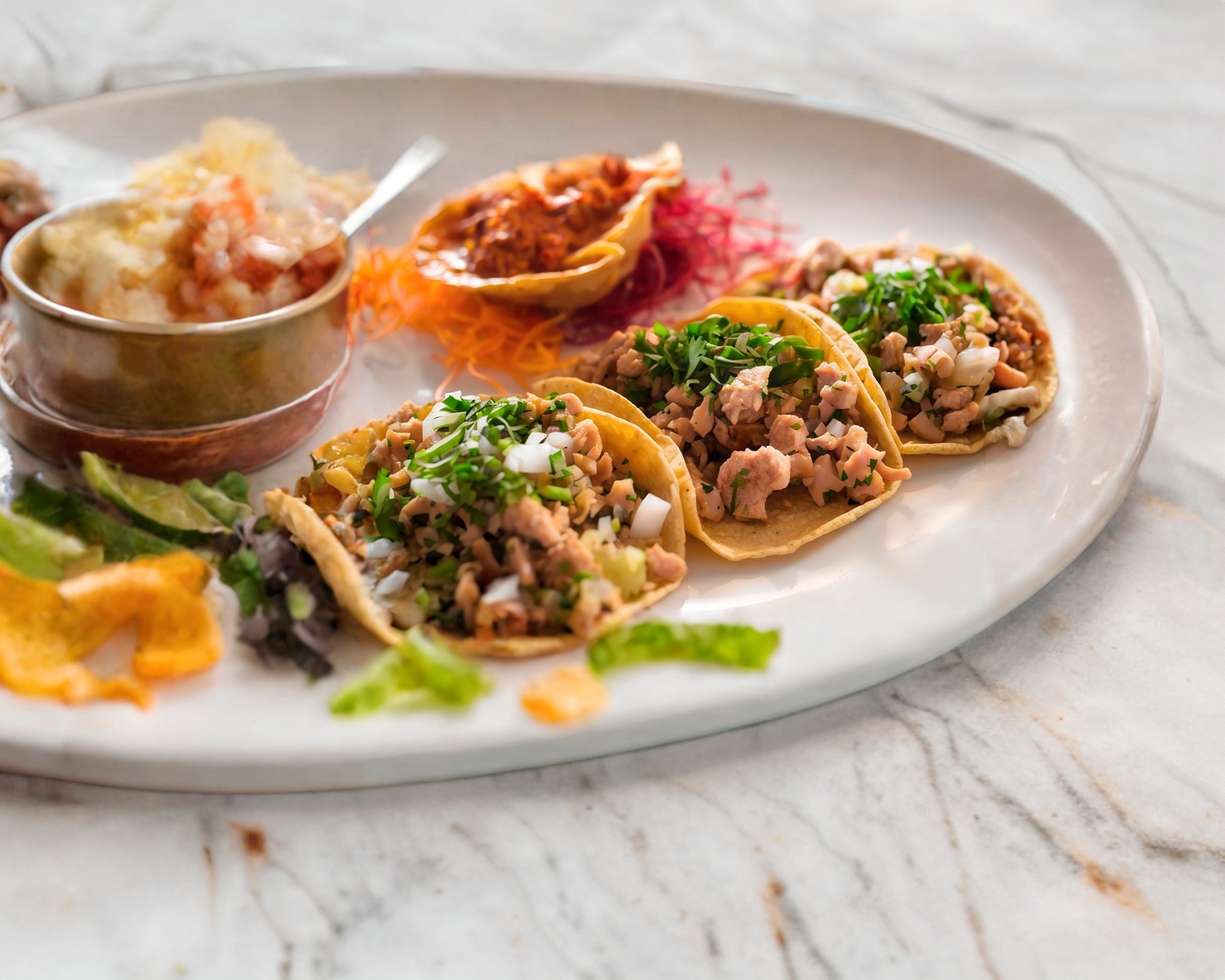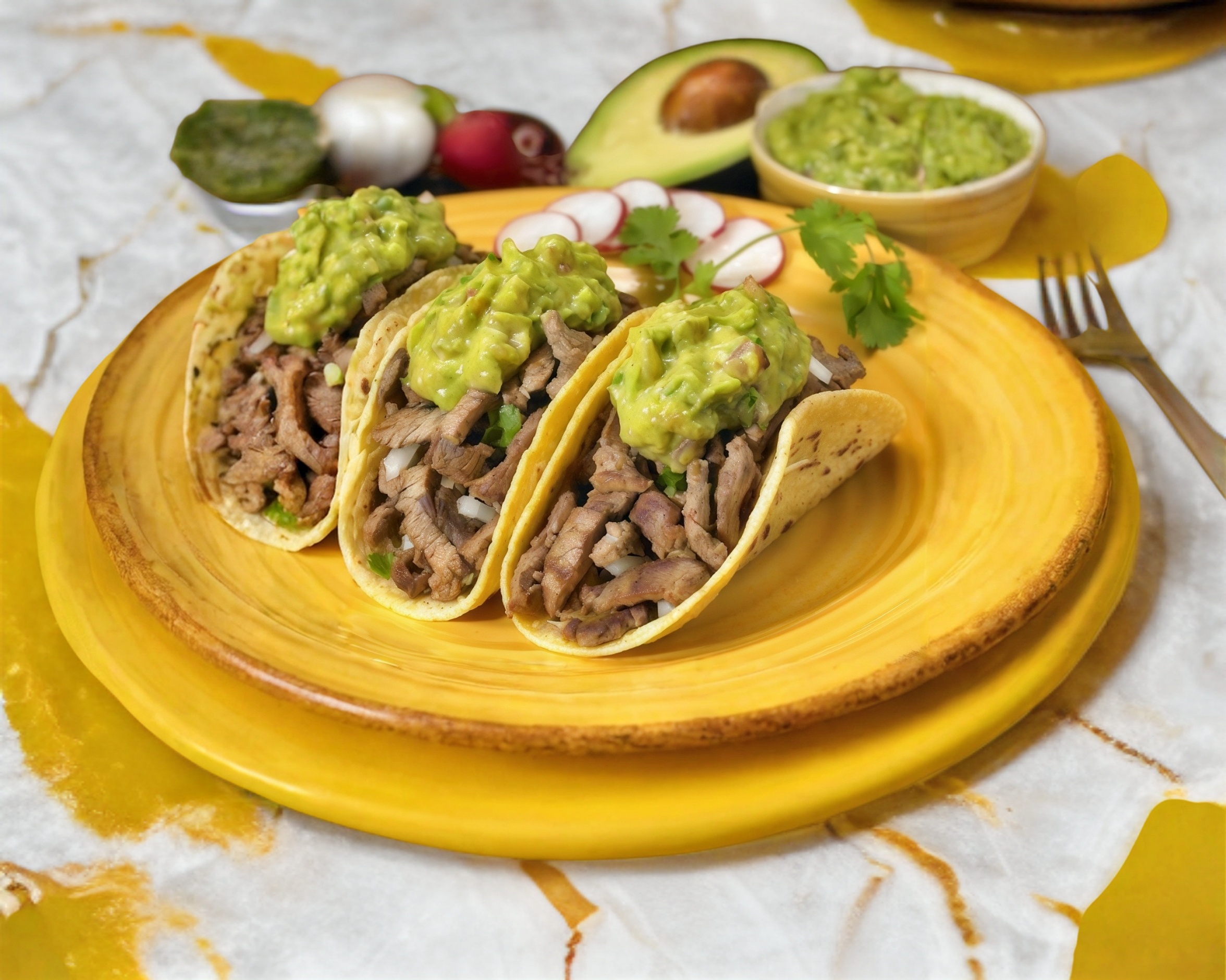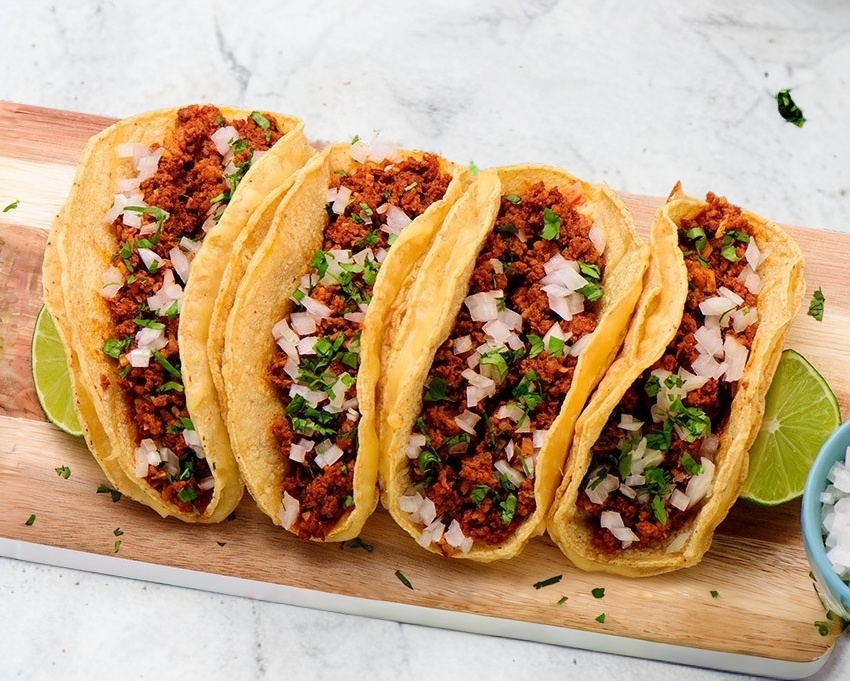 Taco de bistec y chorizo, con cebolla, cilantro y salsa