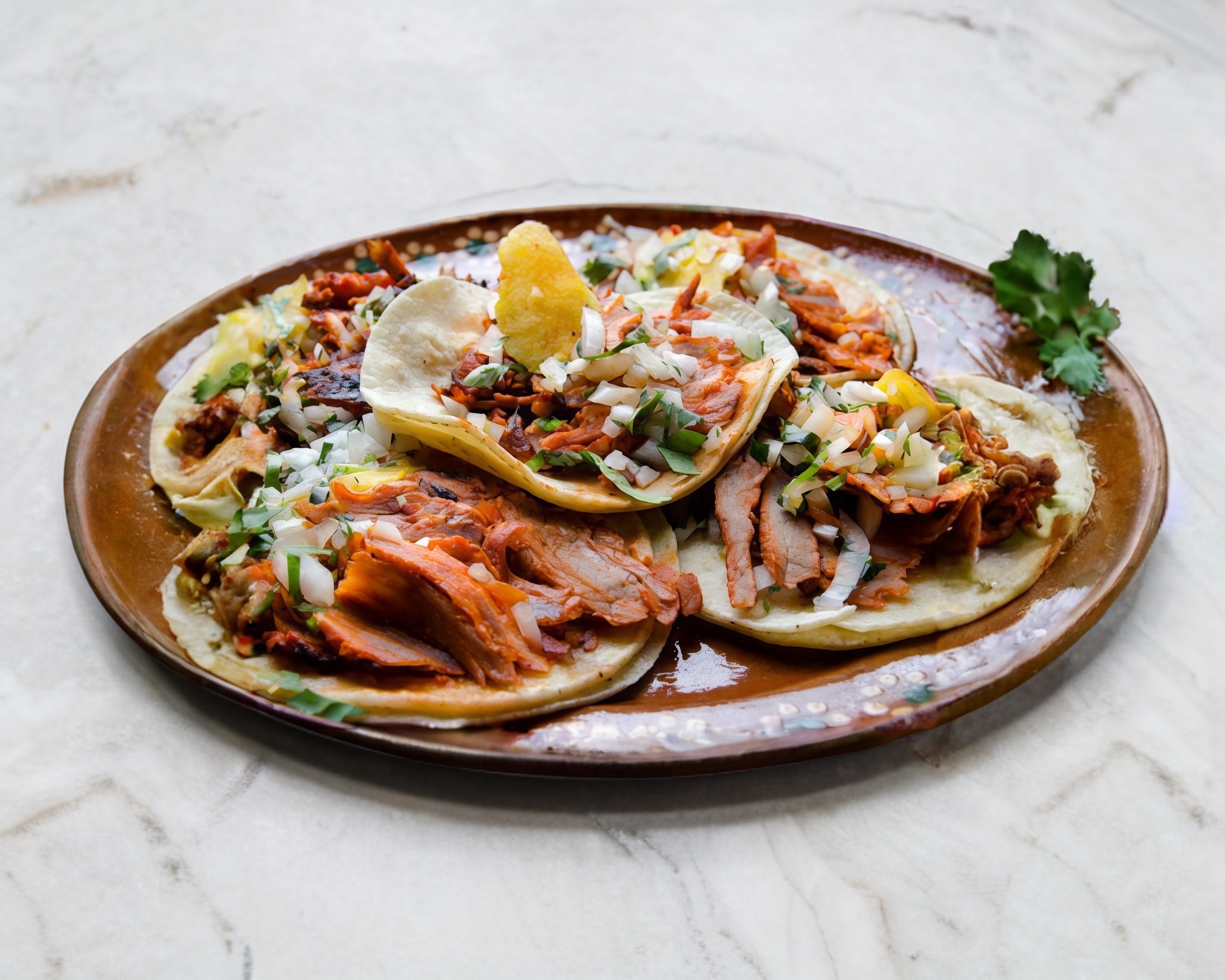 Taco de carne al pastor, con cebolla, cilantro y salsa