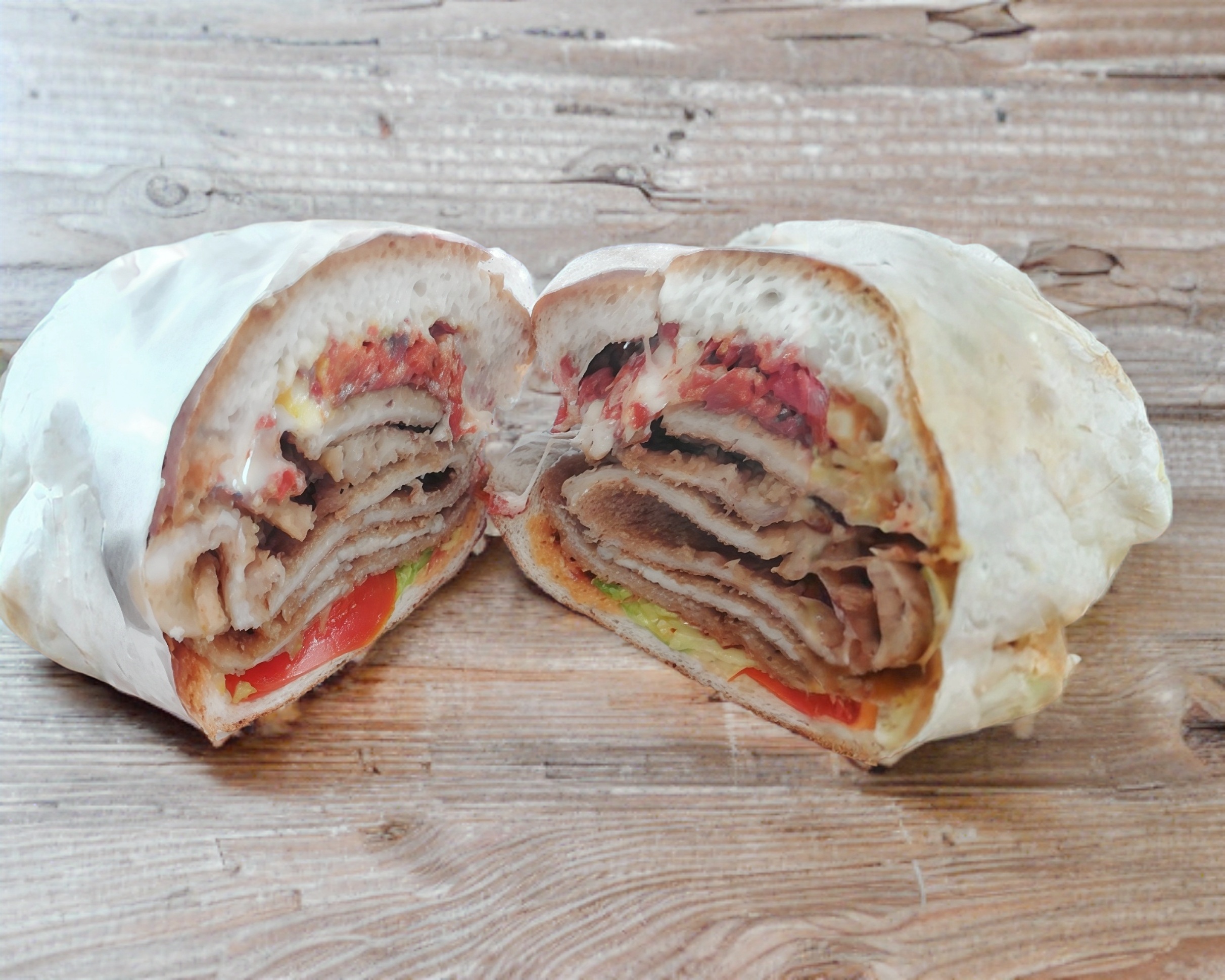 Deliciosa torta de milanesa, salchicha, pierna picante a elegir rajas o chipotle