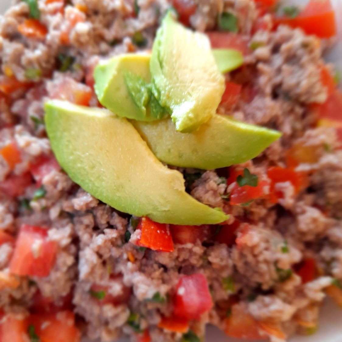 CARNE MOLIDA DE RES COCIDA CON JUGO DE LIMÓN, JITOMATE,CILANDRO, CHILE