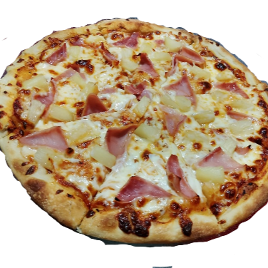 Pizza de 35cm con 8 rebanadas, salsa de tomate, queso mozzarella, jamón y piña.