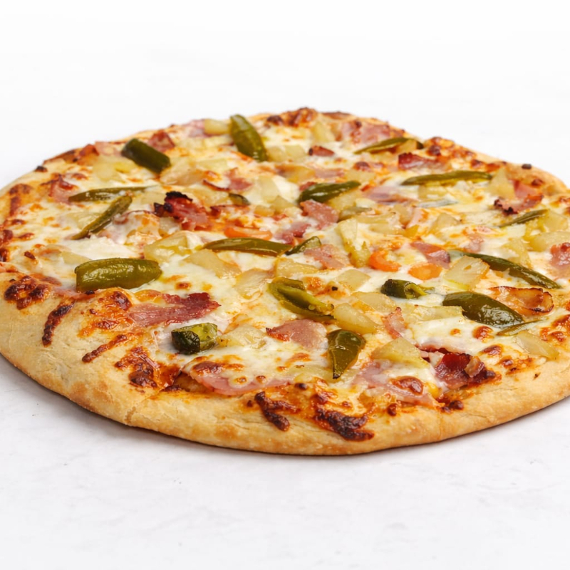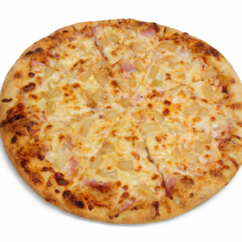 Pizza de 30 cm con 6 rebanada. Salsa de tomate con especias, queso mozzarella, jamon y piña