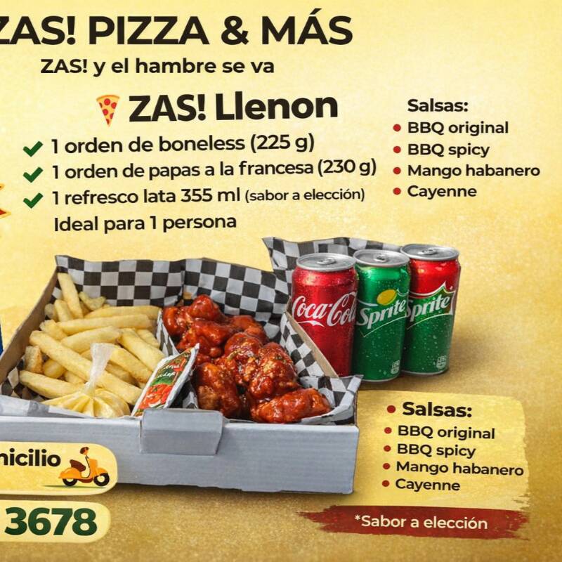 225grs de boneles (salsa a elección) acompañado con 150grs de papas a la francesa + 1 refresco de 600ml