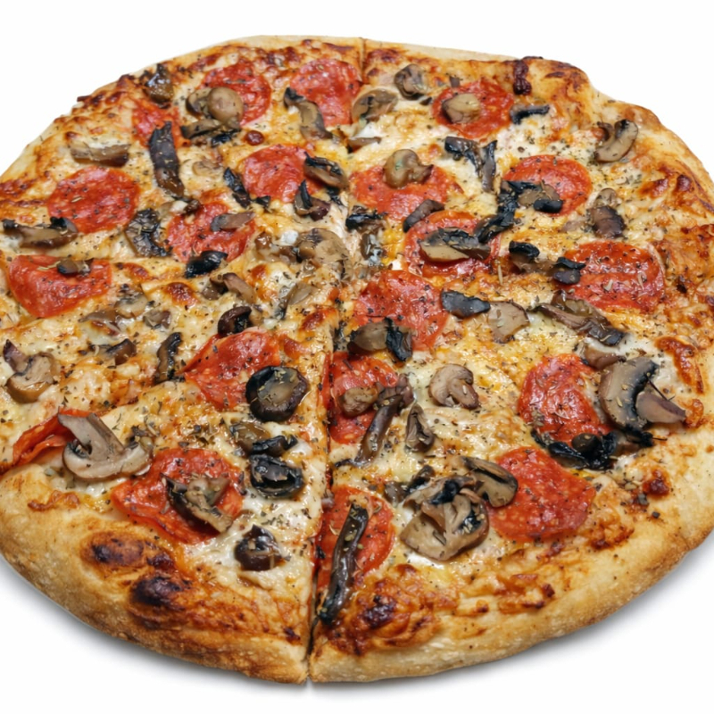 Pizza de 30 cm con 6 rebanadas. Salsa de tomate, queso mozzarella, pepperoni, champiñon y finas hiervas