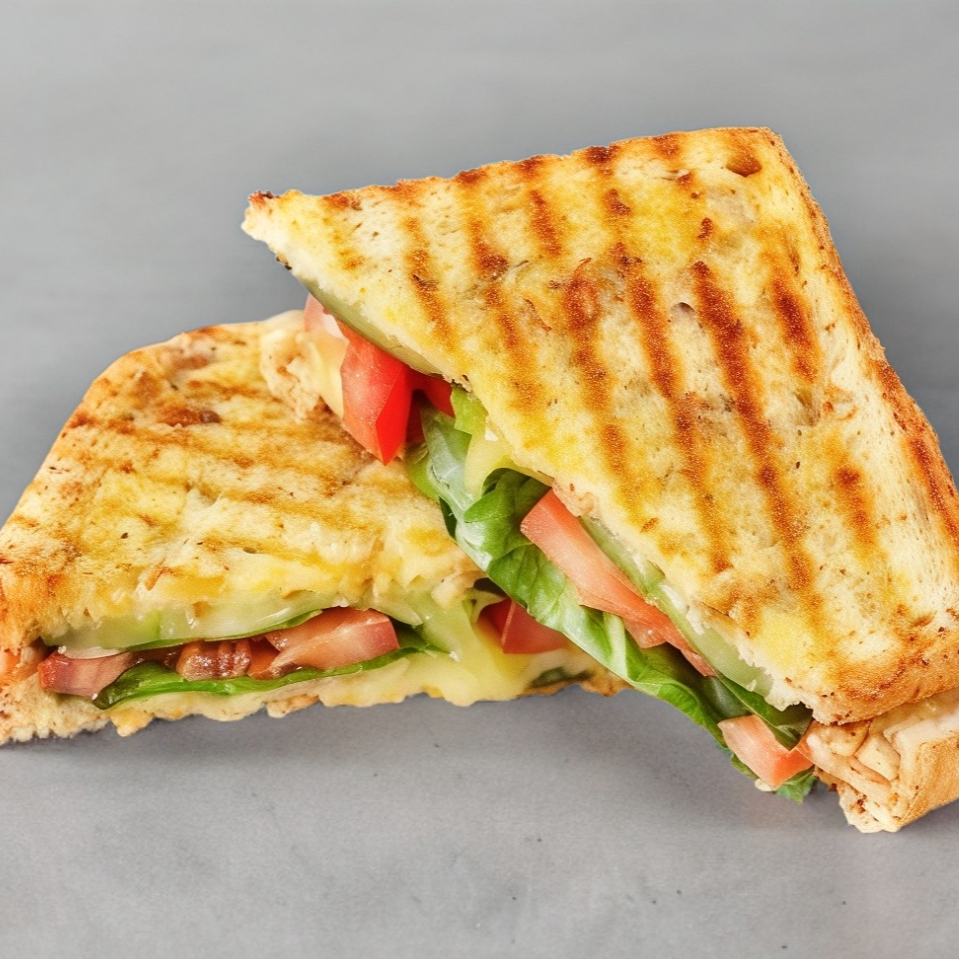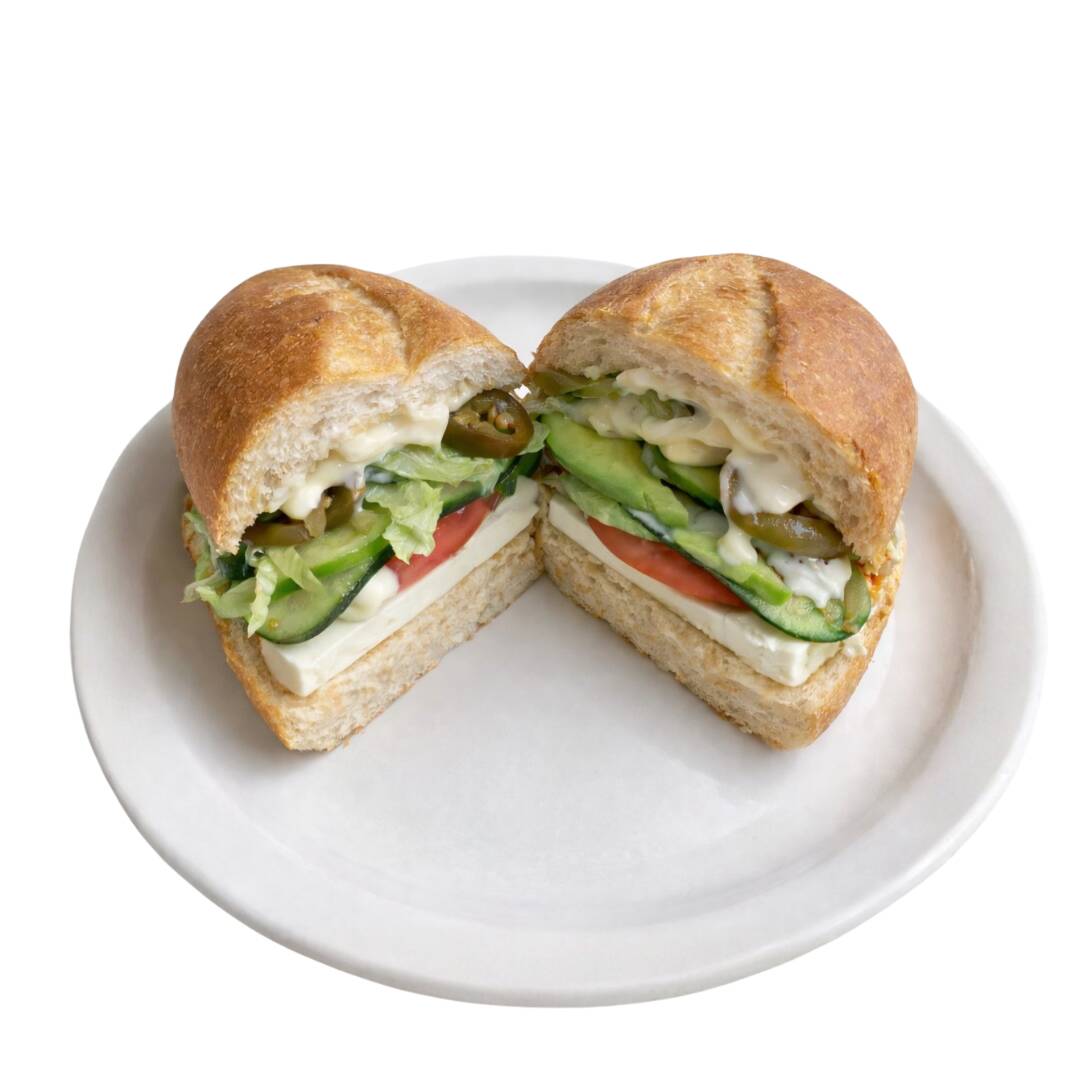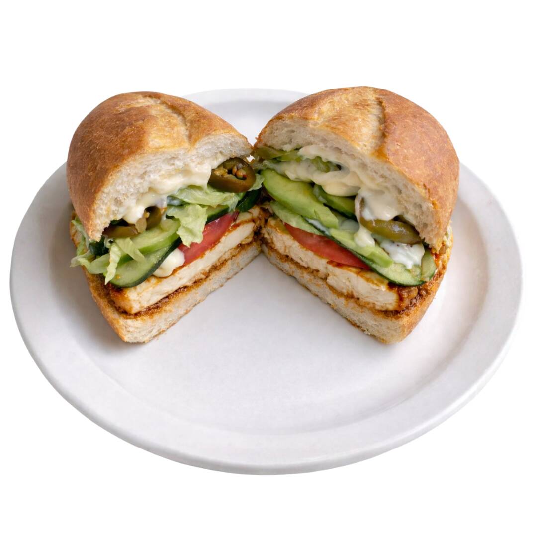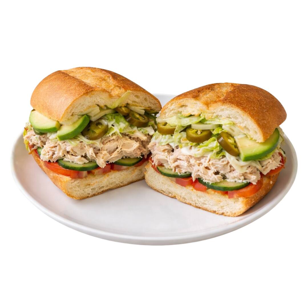 Sándwich con pan integral, queso panela, pollo, lechuga italiana, jitomate, pepino y aderezo. (Porción personal)