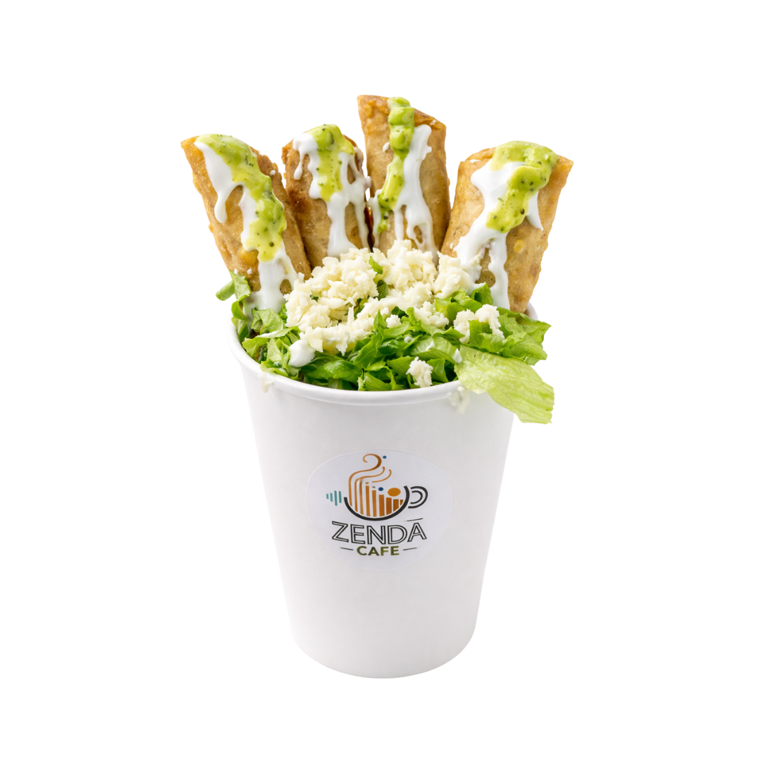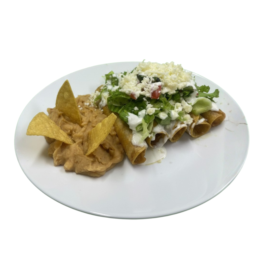 4 tacos dorados, rellenos, salsa aguacatosa, verdura, crema y salsa picante