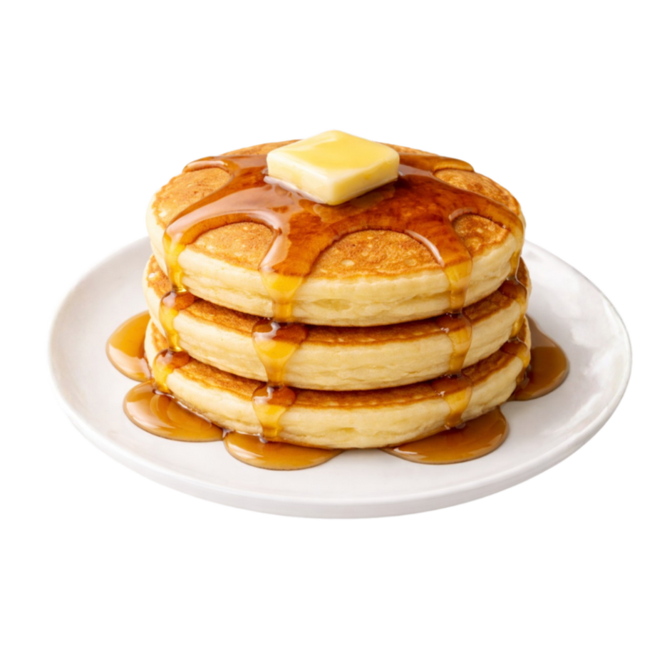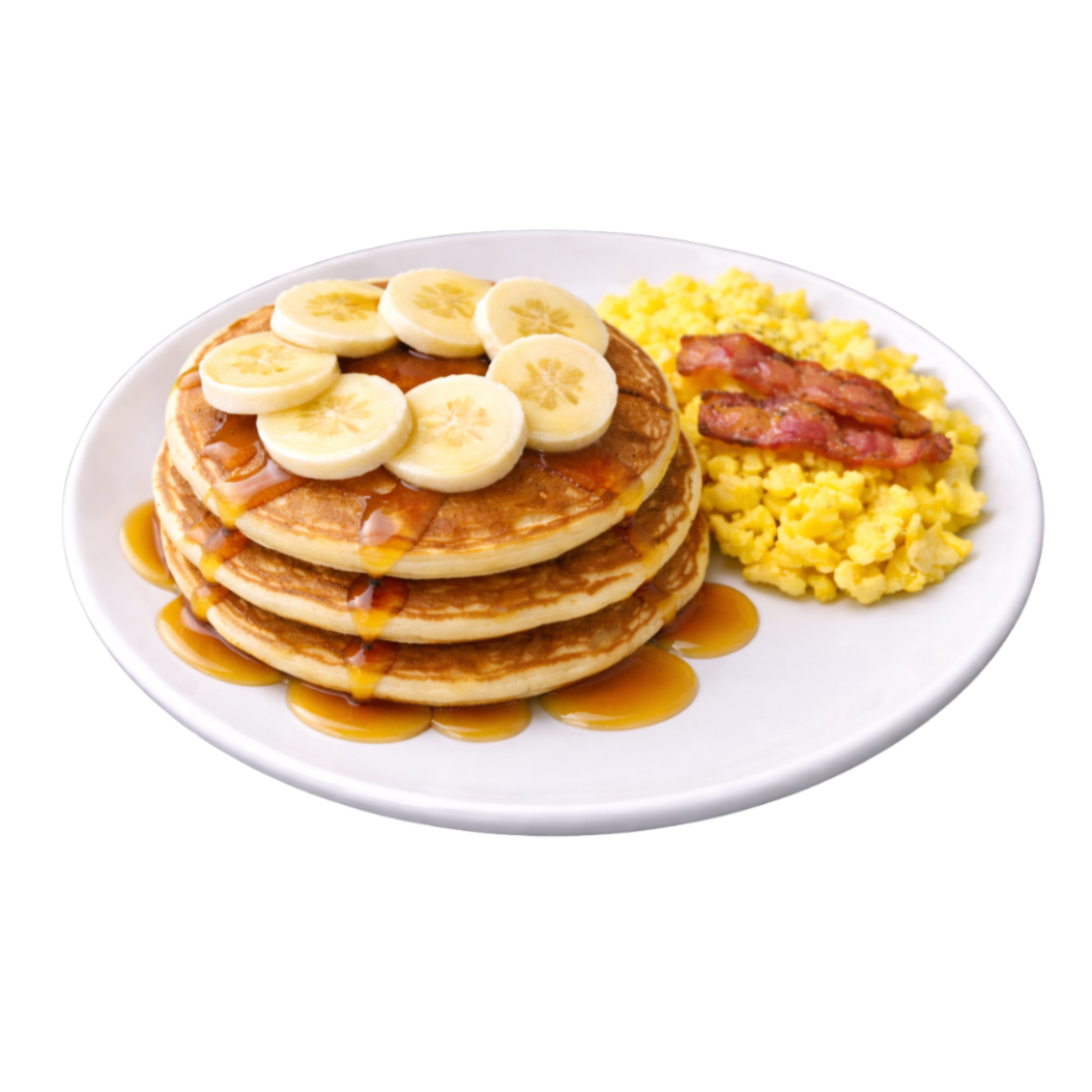 3 deliciosos y esponjosos hot cakes, acompañados con huevo revuelto y tocino.