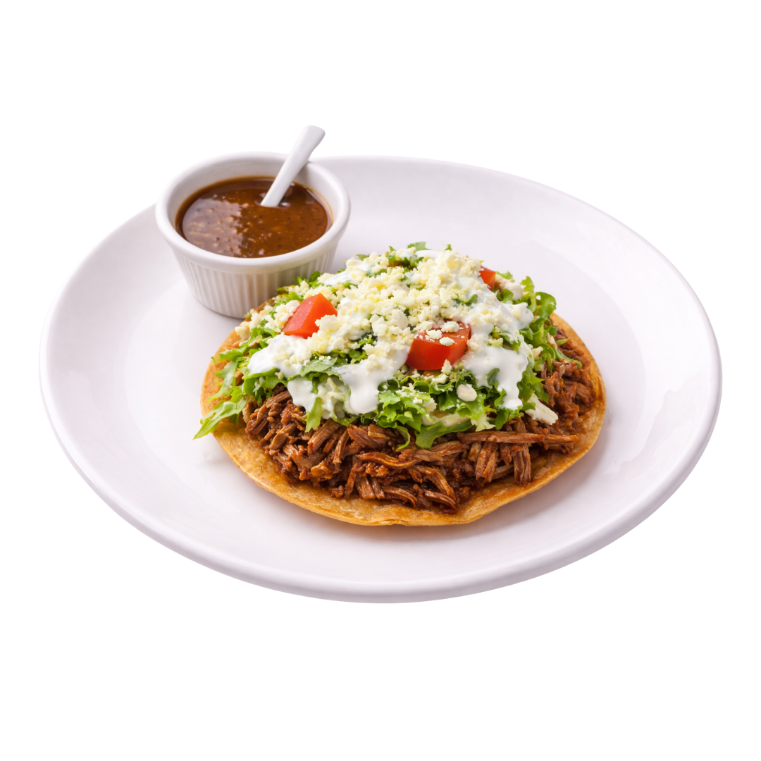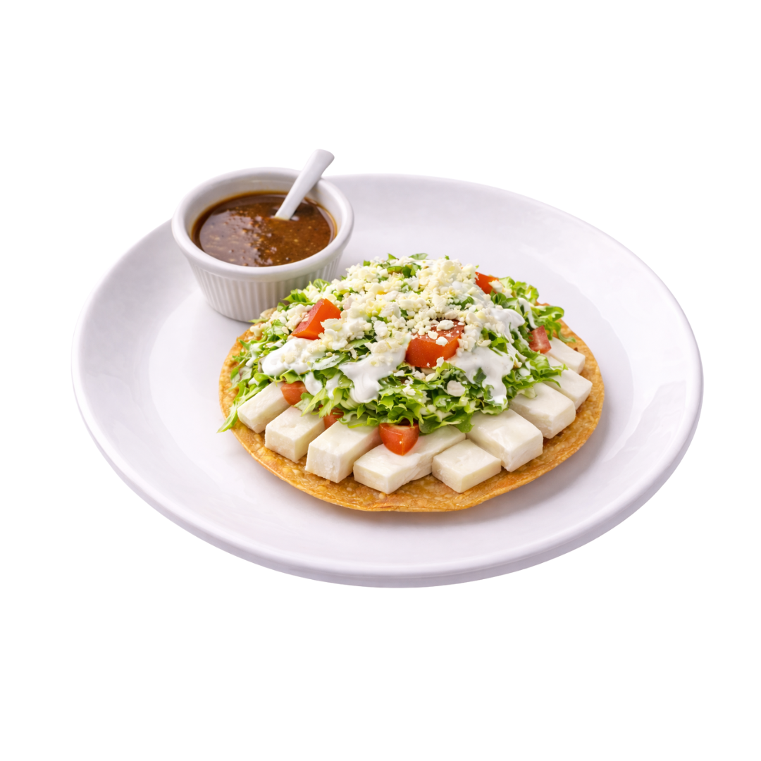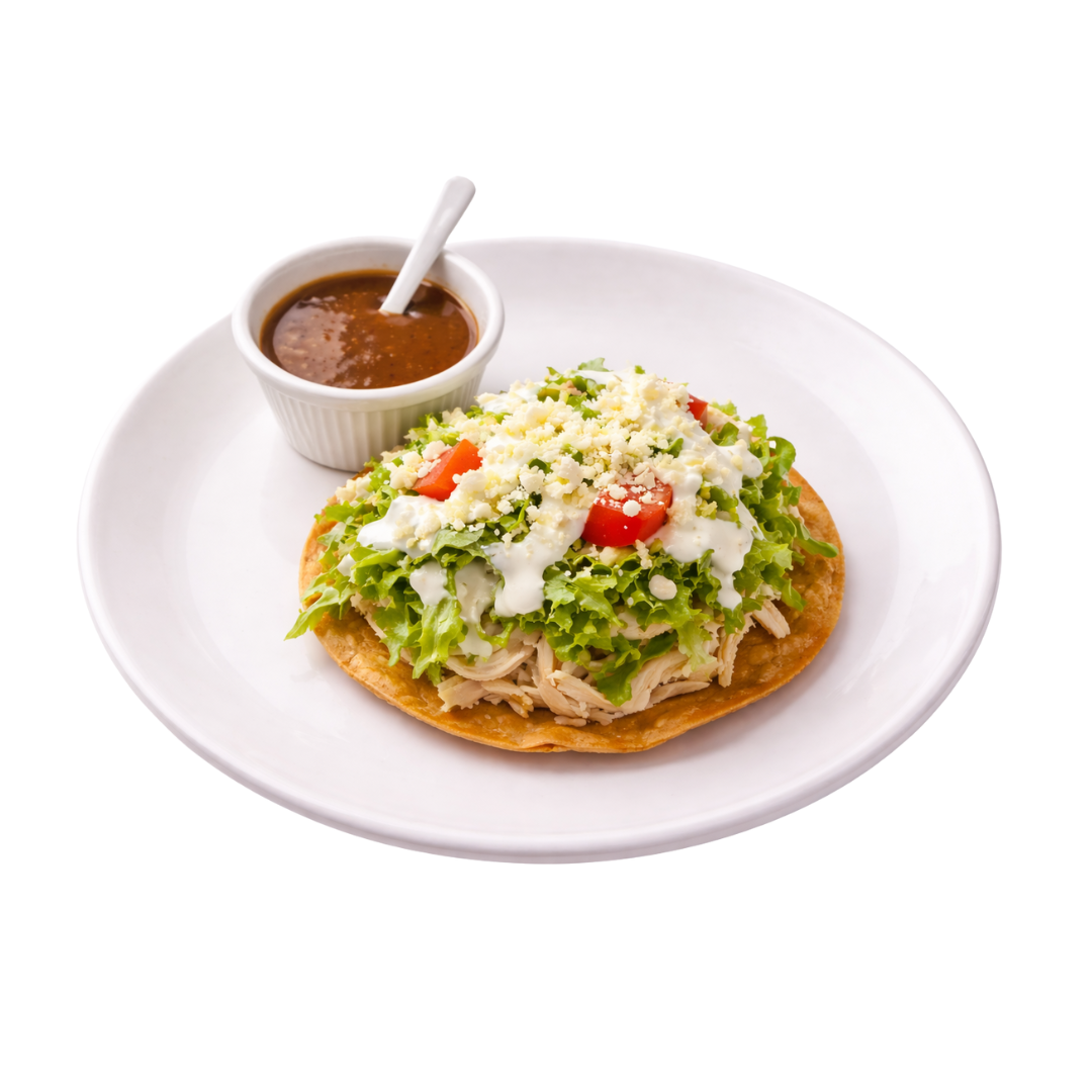 Deliciosa tostada, preparada con crema, queso, proteína de tu eleción, lechuga y jitomate.