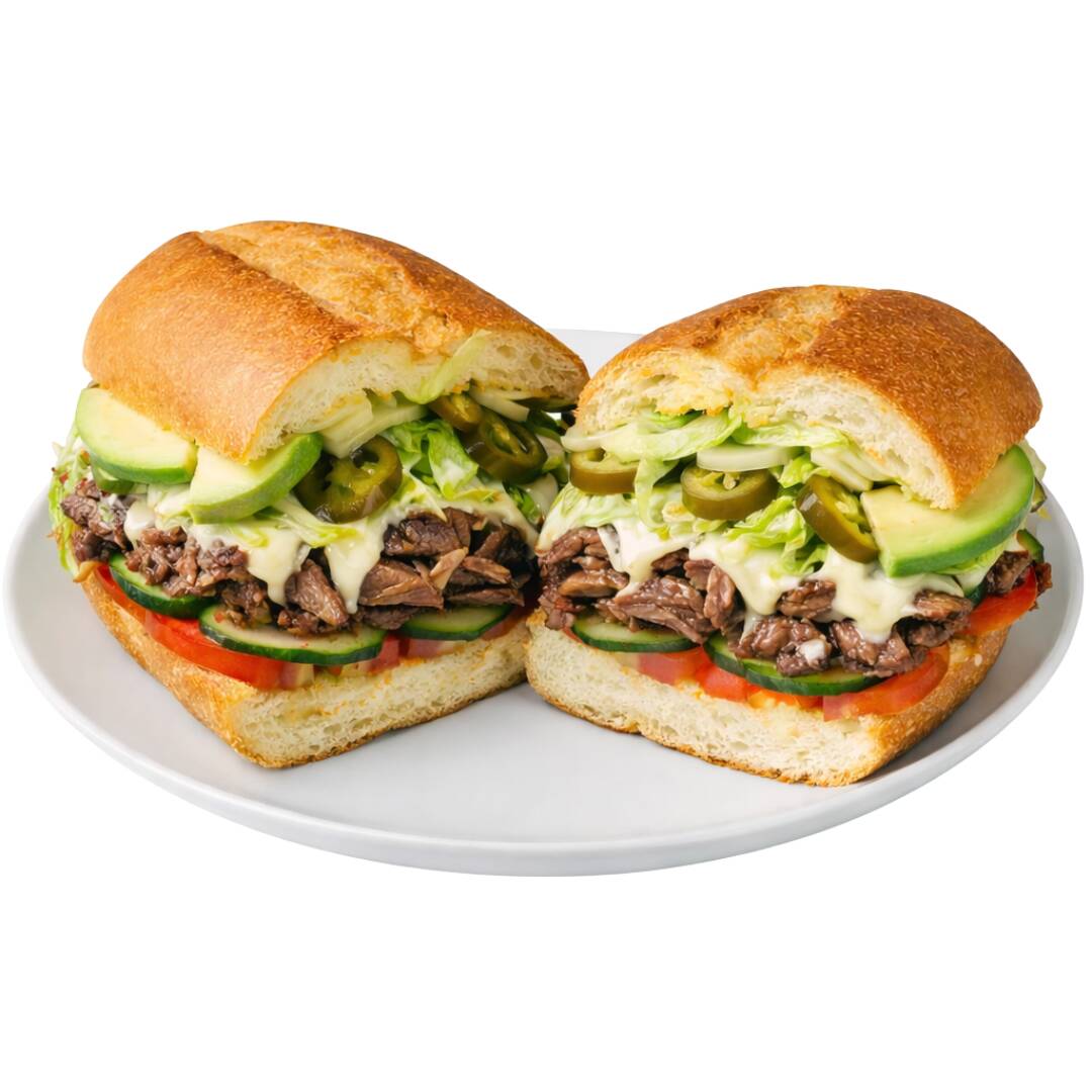 Arrachera, queso blanco, mayonesa, chiles en vinagre, aguacate, lechuga, jitomate y pepino