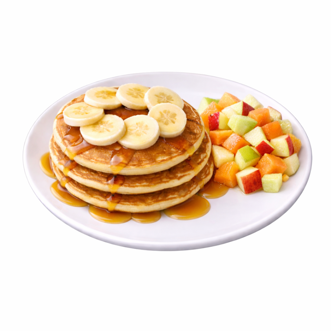 3 deliciosos y esponjosos hot cakes con fruta de temporada.