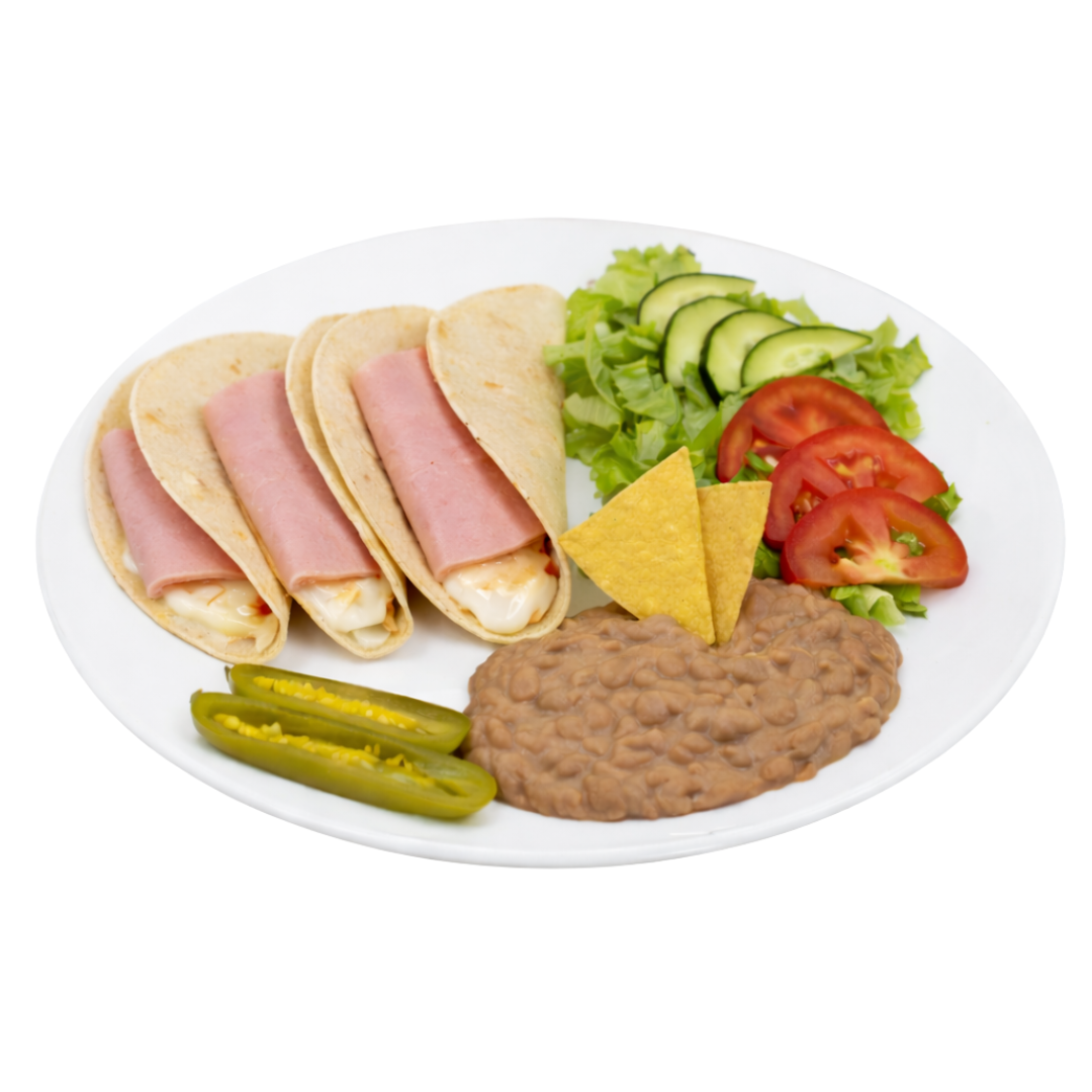 3 quesadillas calientitas con queso derretido, jamón, frijoles y ensalada para acompañar