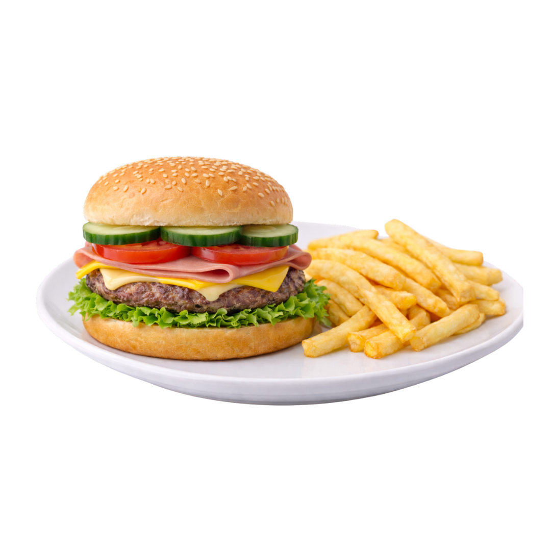 Hamburguesa con carne sirloin, queso oaxaca, queso amarillo, lechuga italiana, jitomate, pepinos y aderezo. Acompañada de papas fritas