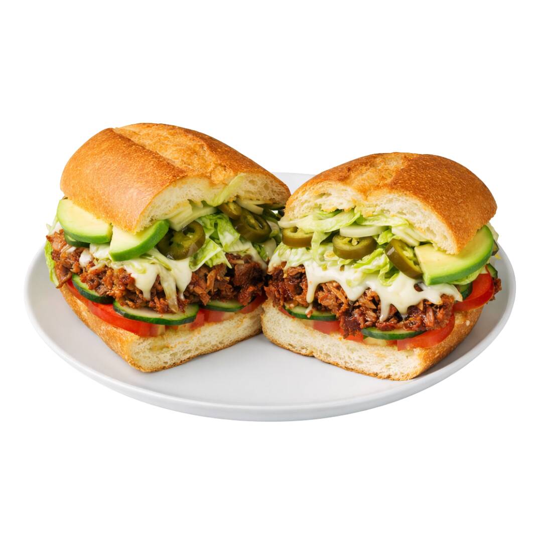 Tinga de res, queso blanco, mayonesa, chiles en vinagre, aguacate, lechuga, jitomate y pepino