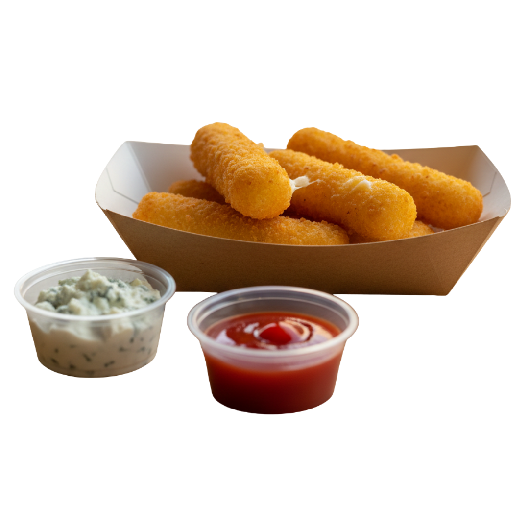 5 piezas de dedos de queso mozarella acompañados de aderezo.