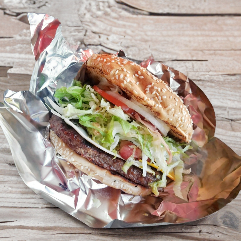 130 grs de exquisita carne de res, doble queso amarillo, aderezos (mayonesa, mostaza y catsup), Sazonadas con salsa BBQ, pimienta y mantequilla
