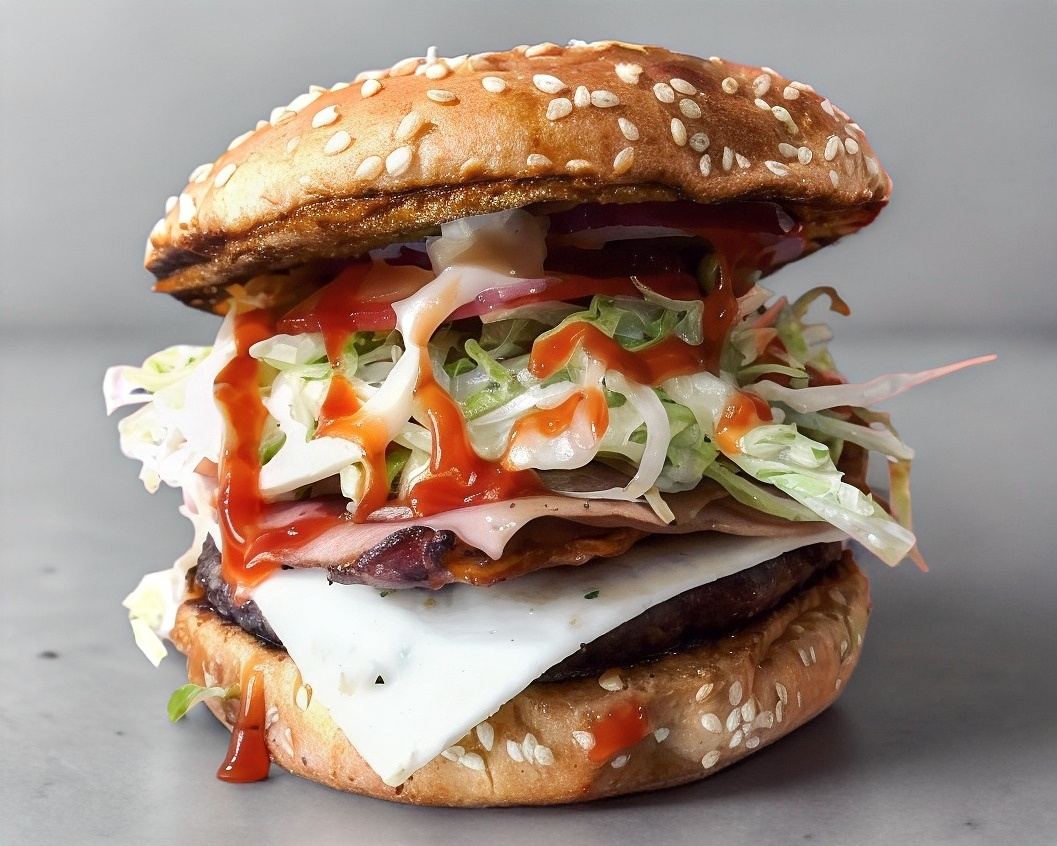 130 grs de exquisita carne de res, jamón, lechuga, tomate, cebolla, chile jalapeño, queso amarillo, aderezos (mayonesa, mostaza y catsup), Sazonadas con salsa BBQ, pimienta y mantequilla