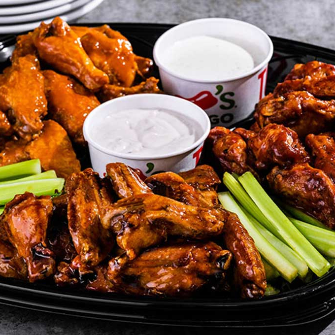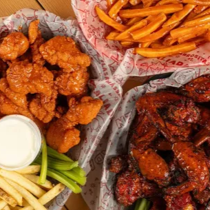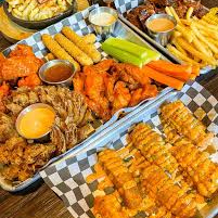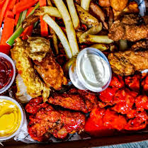 30 alitas, 6 dedos de queso, 10 aros de cebolla, 3 salsas a elegir, papas, vegetales y 4 aderezos