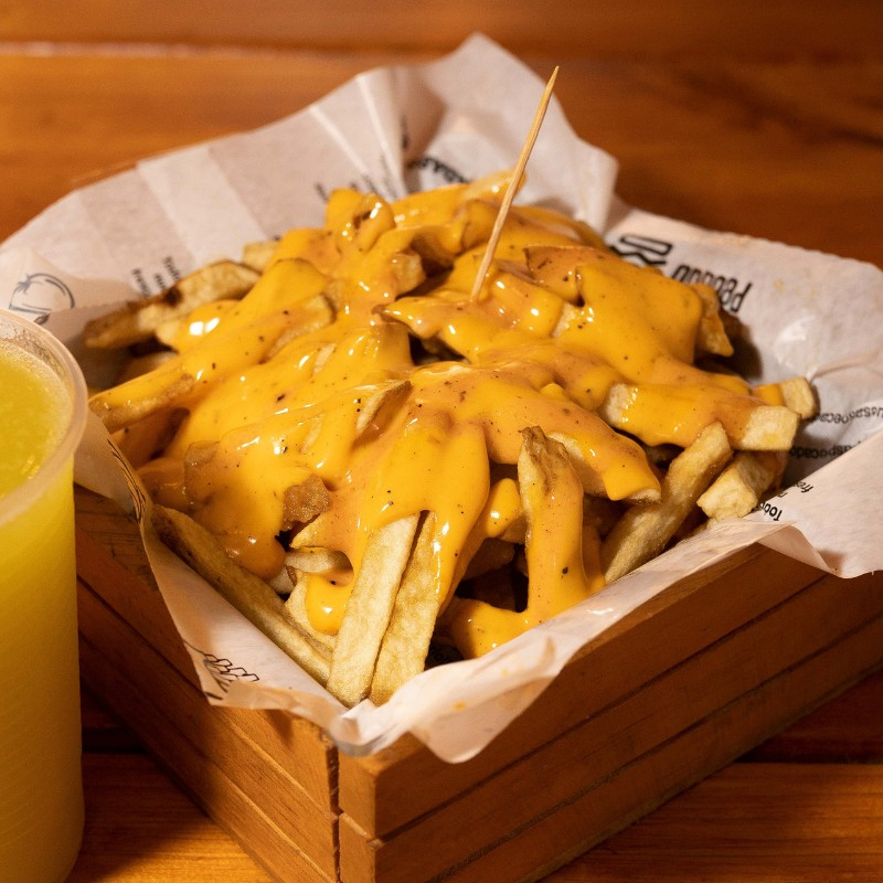 Papas a la francesa con queso cheddar, parmesanon y valentina