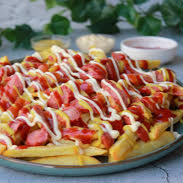 Trocitos de salchicha con papas a la francesa acompañadas con queso cheddar, aderezo ranch y salsa valentina
