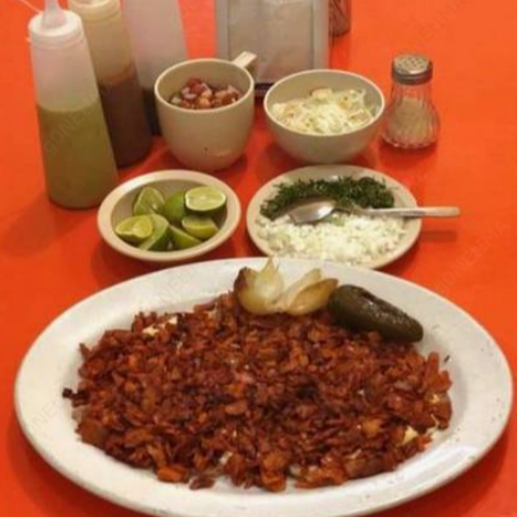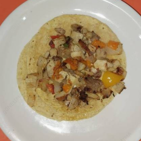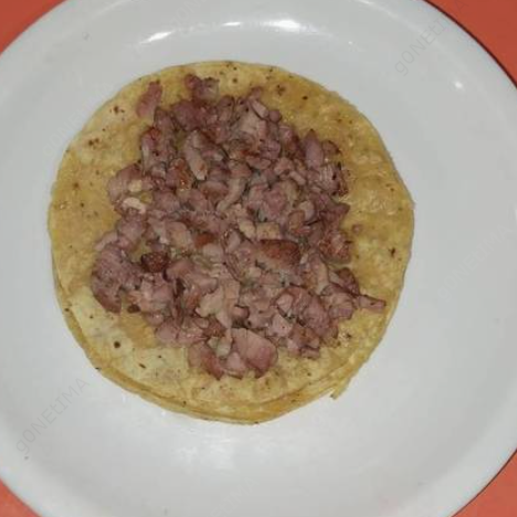 platillo: carne de pastor, morrón, cebolla, tocino, y tortillas