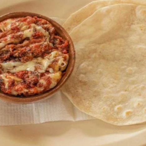 Queso fundido con bistec de res más tortilla de harina.