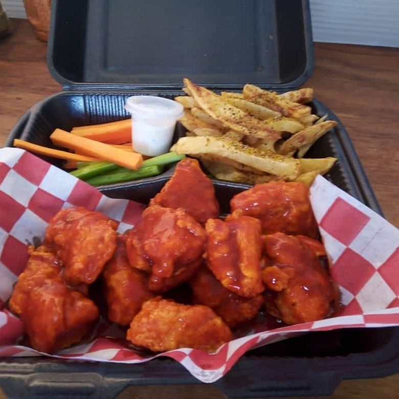 10 Boneless (tamaño grande) bañados en salsa BBQ acompañados de papas, zanahoria, apio y adereso