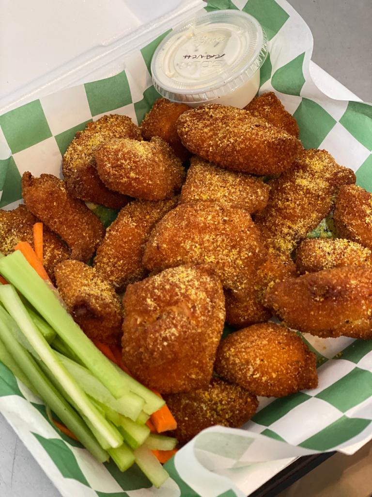 30 alitas de pollo bañadas en cualquiera de nuestras deliciosas salsas escoger, papas, 5 aros de cebolla, 3 dedos de queso y vegetales