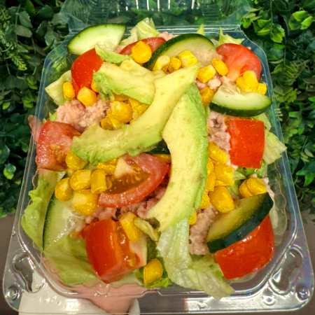 Atún, lechuga, jitomate, pepino, aguacate, elote y mayonesa.