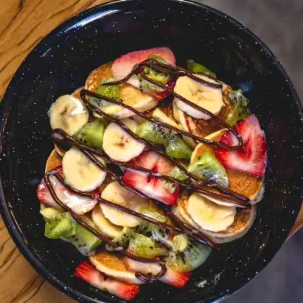 15 mini Hotcakes acompañados de fresas, plátano y chocolate.