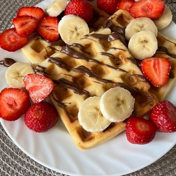 2 waffles preparados acompañados con fresas, plátano cubiertos de chocolate.