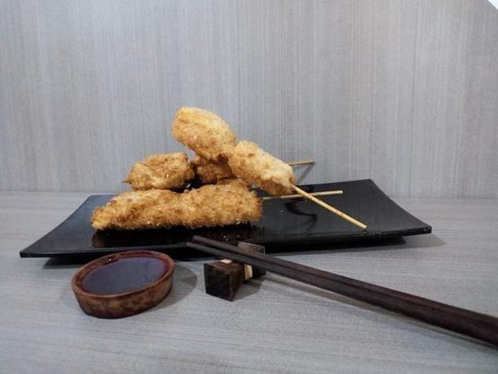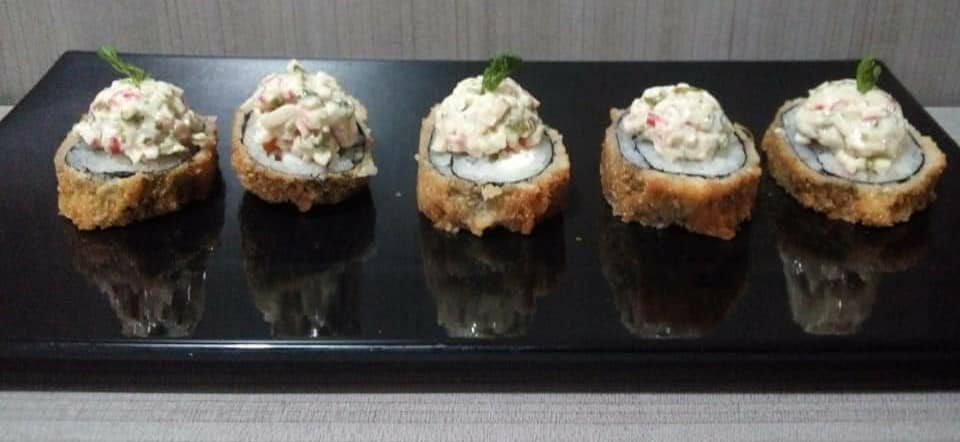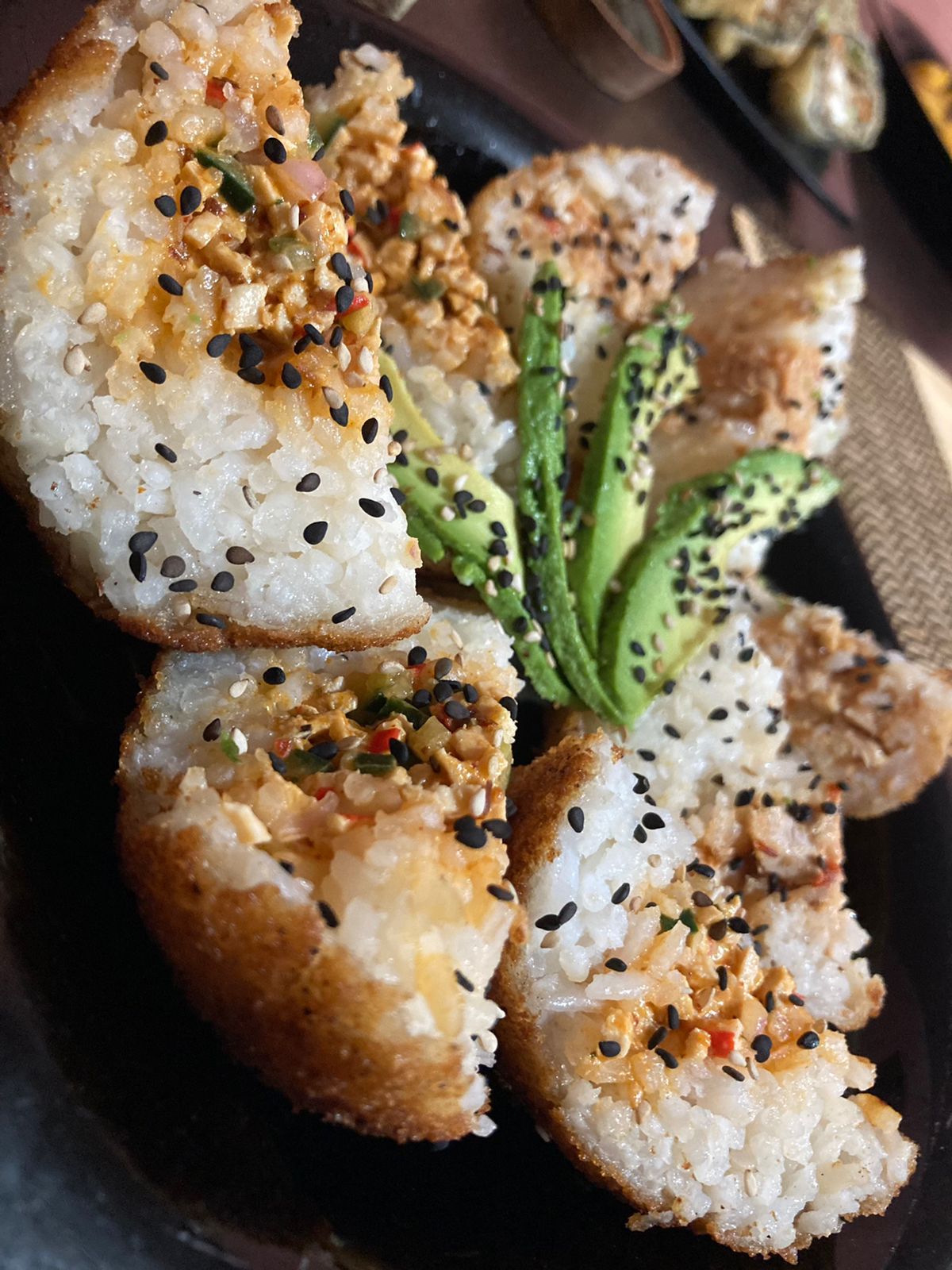Bola de arroz rellena de atún al chipotle y/ó rellena de mezcla de surimi, pepino, zanahoria y salsa de la casa (picante) empanizados por fuera.