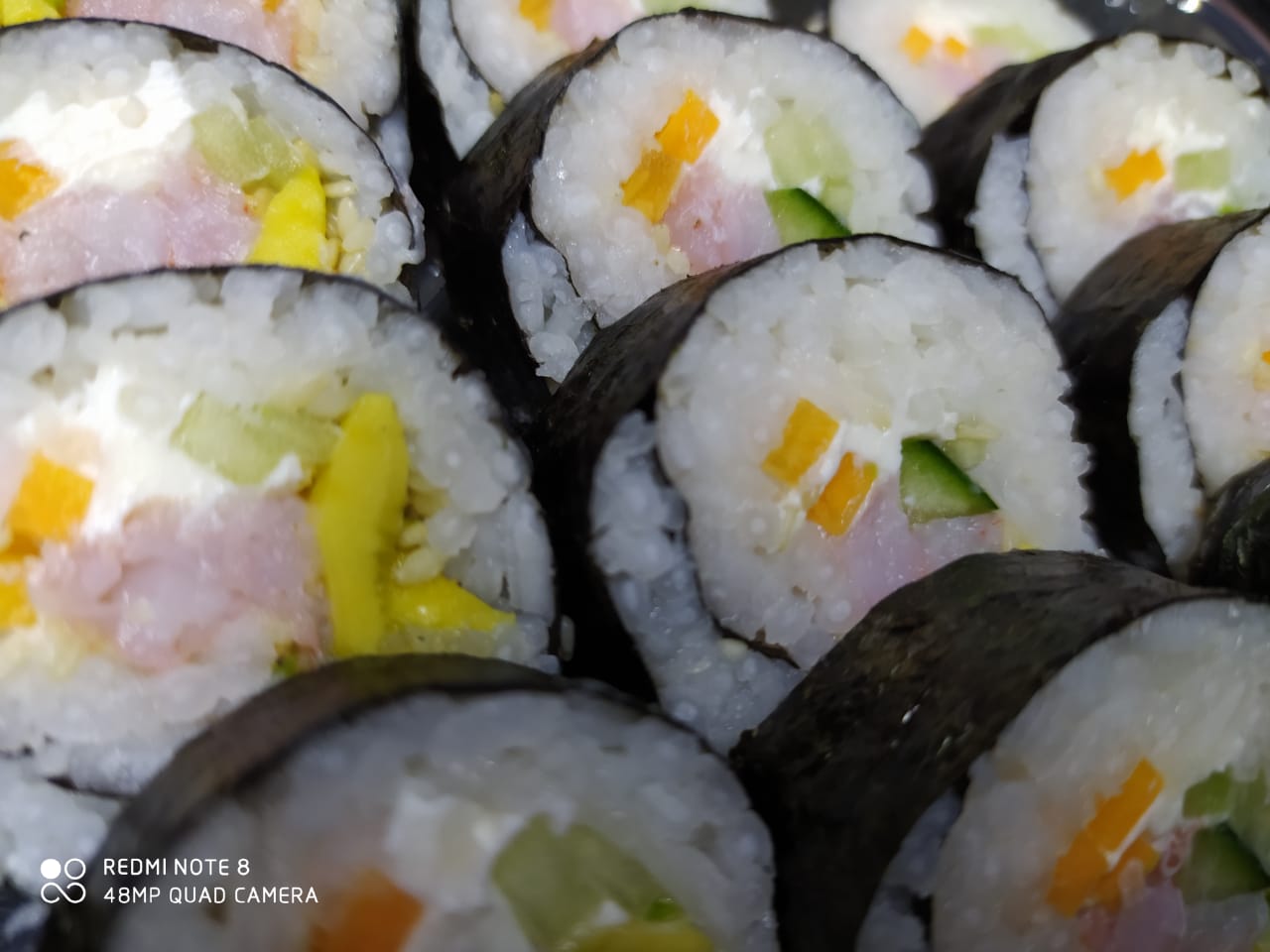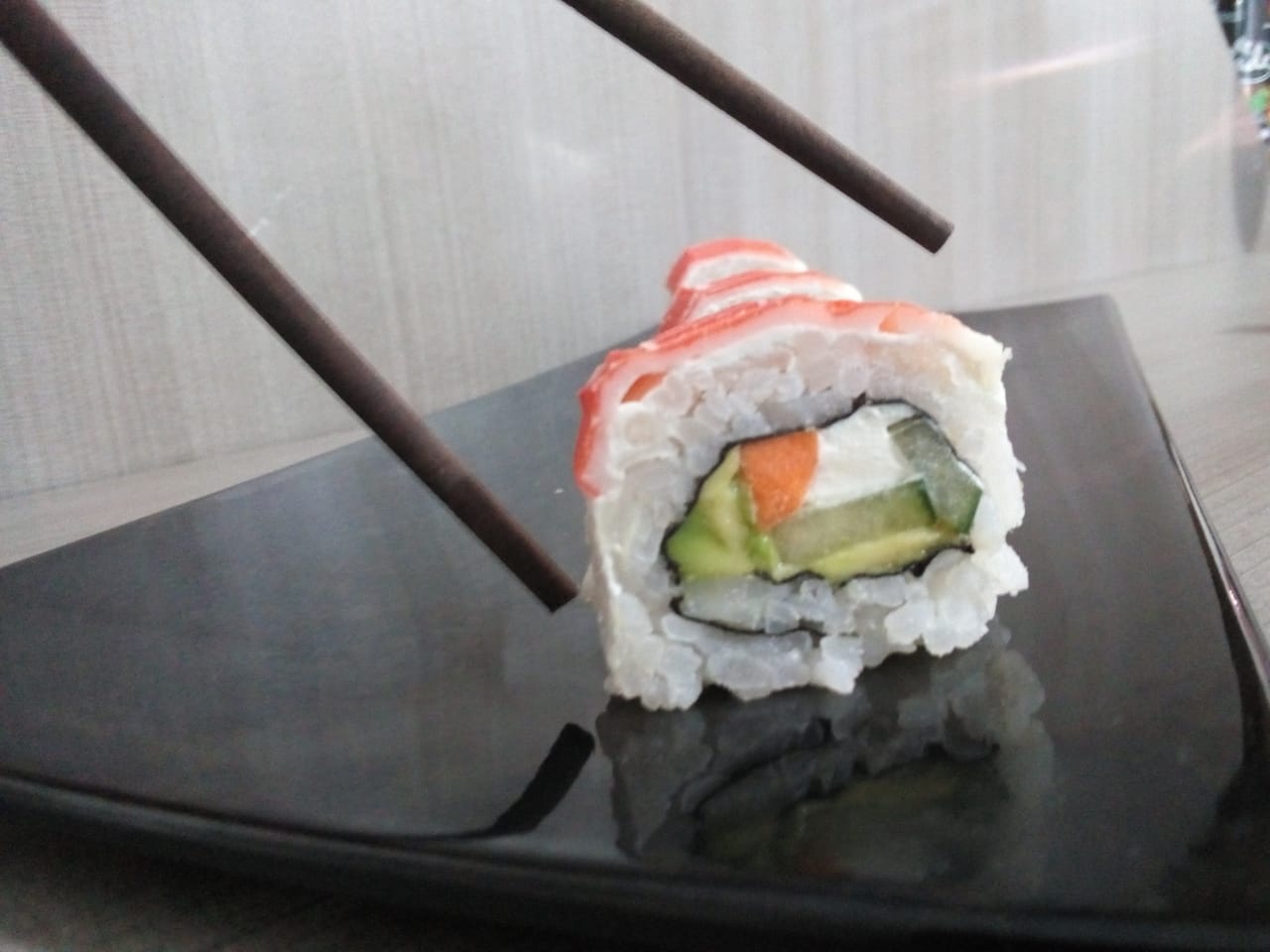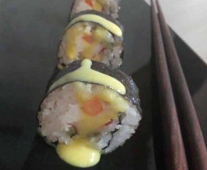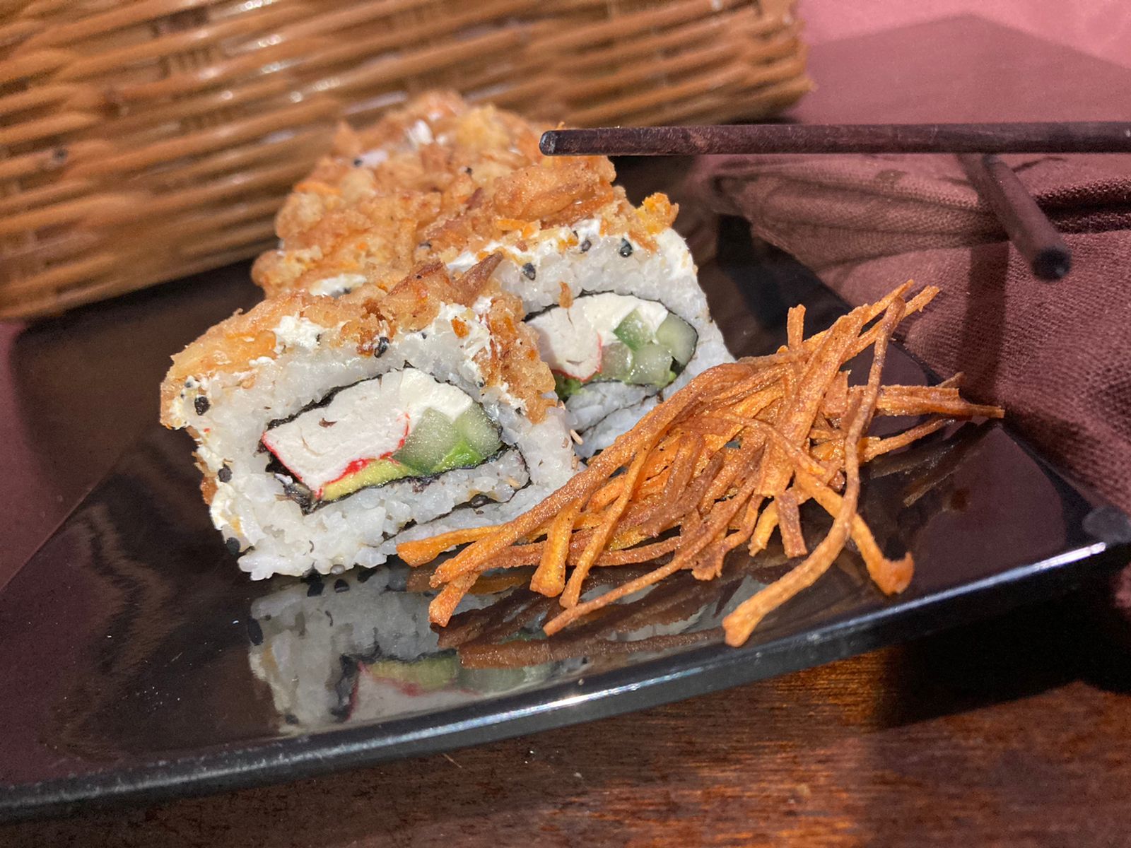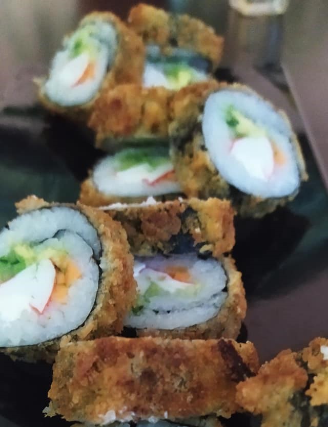 Por dentro surimi, pepino, aguacate y queso crema; por fuera arroz y cubierto de zanahoria tempurizada.