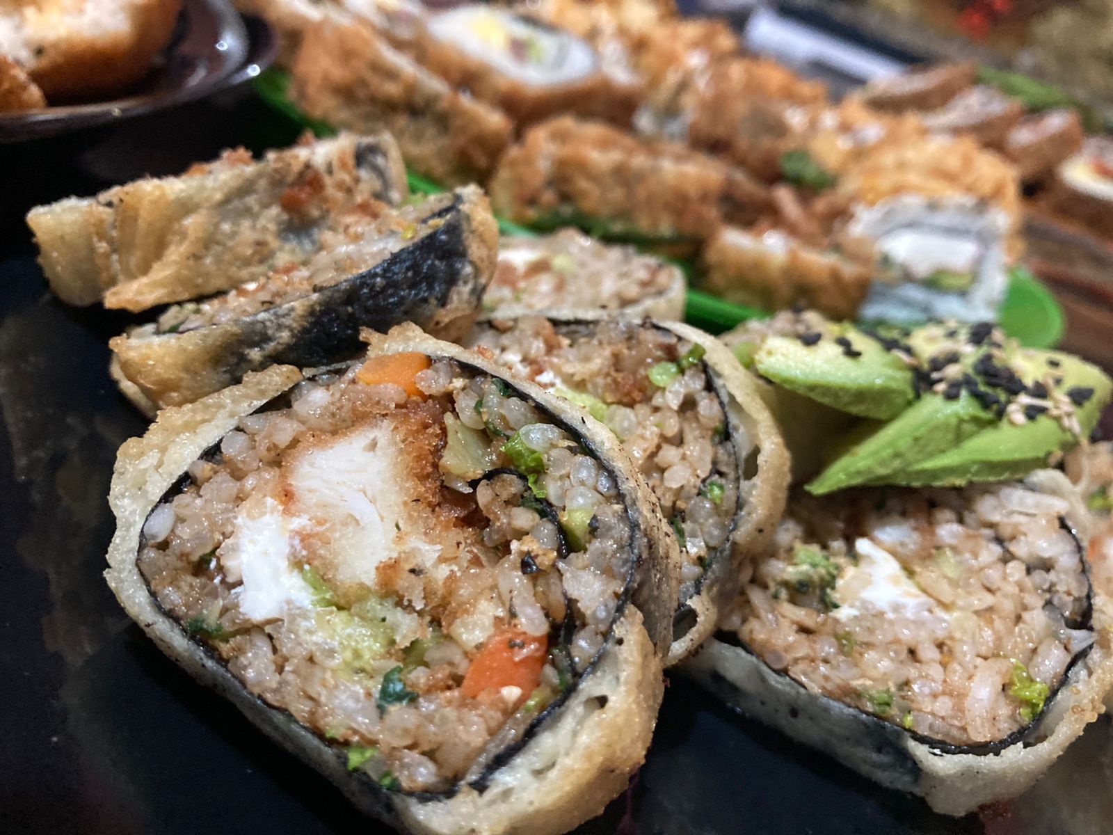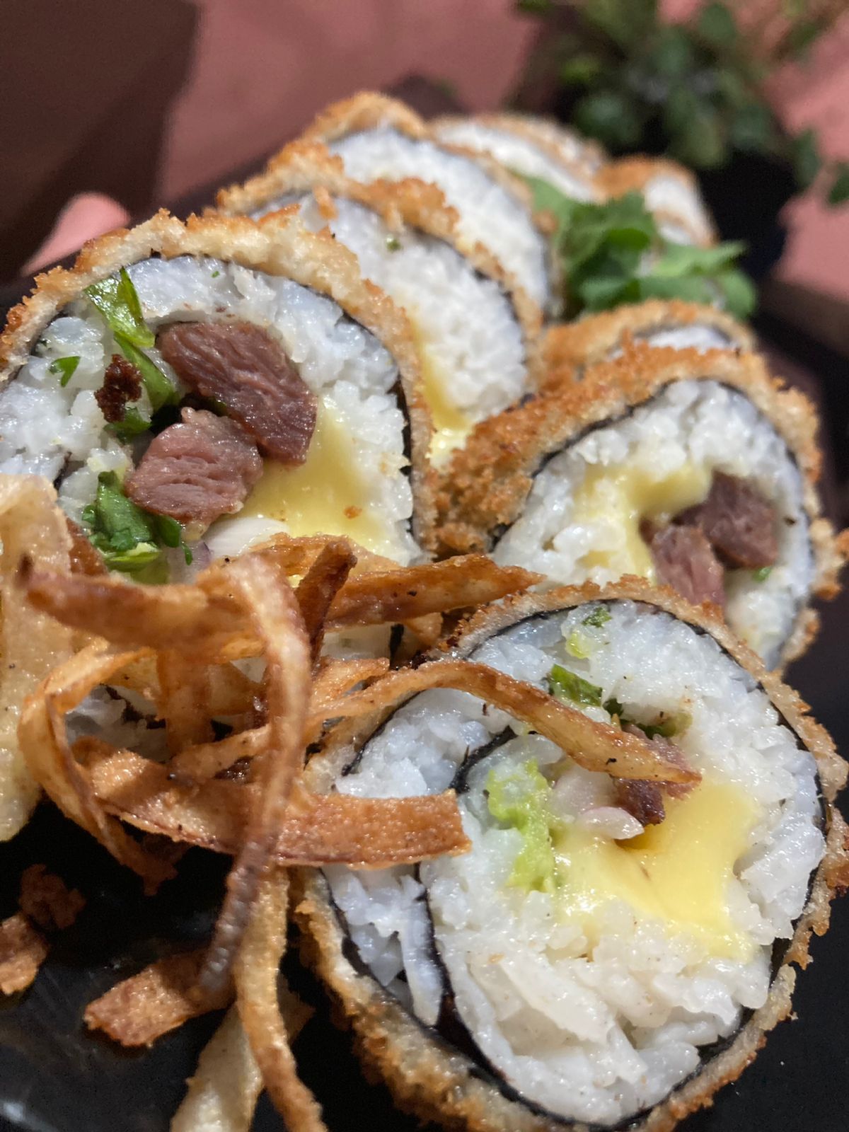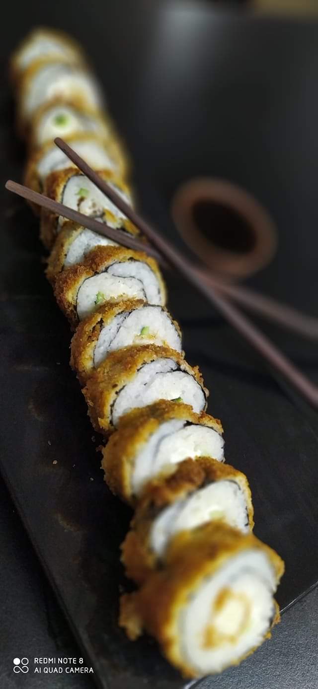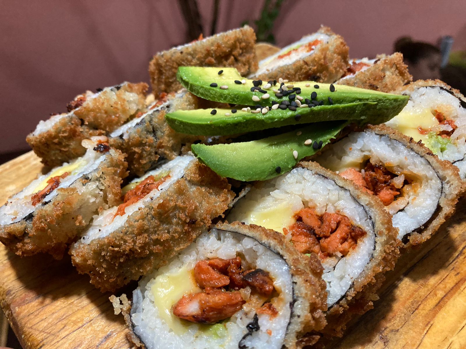Con base de yakimeshi, relleno de pollo empanizado, aguacate y queso crema empanizado por fuera.