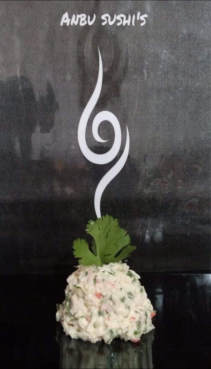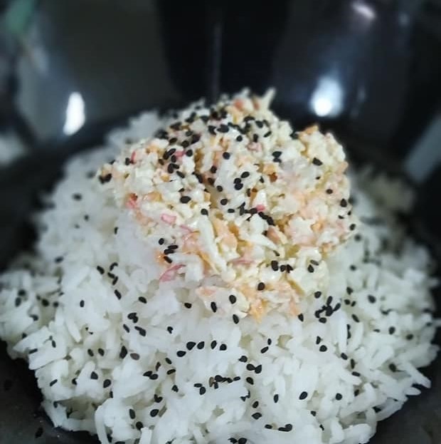 Mezcla de verduras, surimi, mayonesa y condimento japonés.