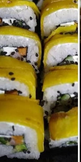 Camarón cocido (dentro) platano frito (fuera)todos nuestros rollos llevan por dentro zanahoria, pepino, queso crema y aguacate.