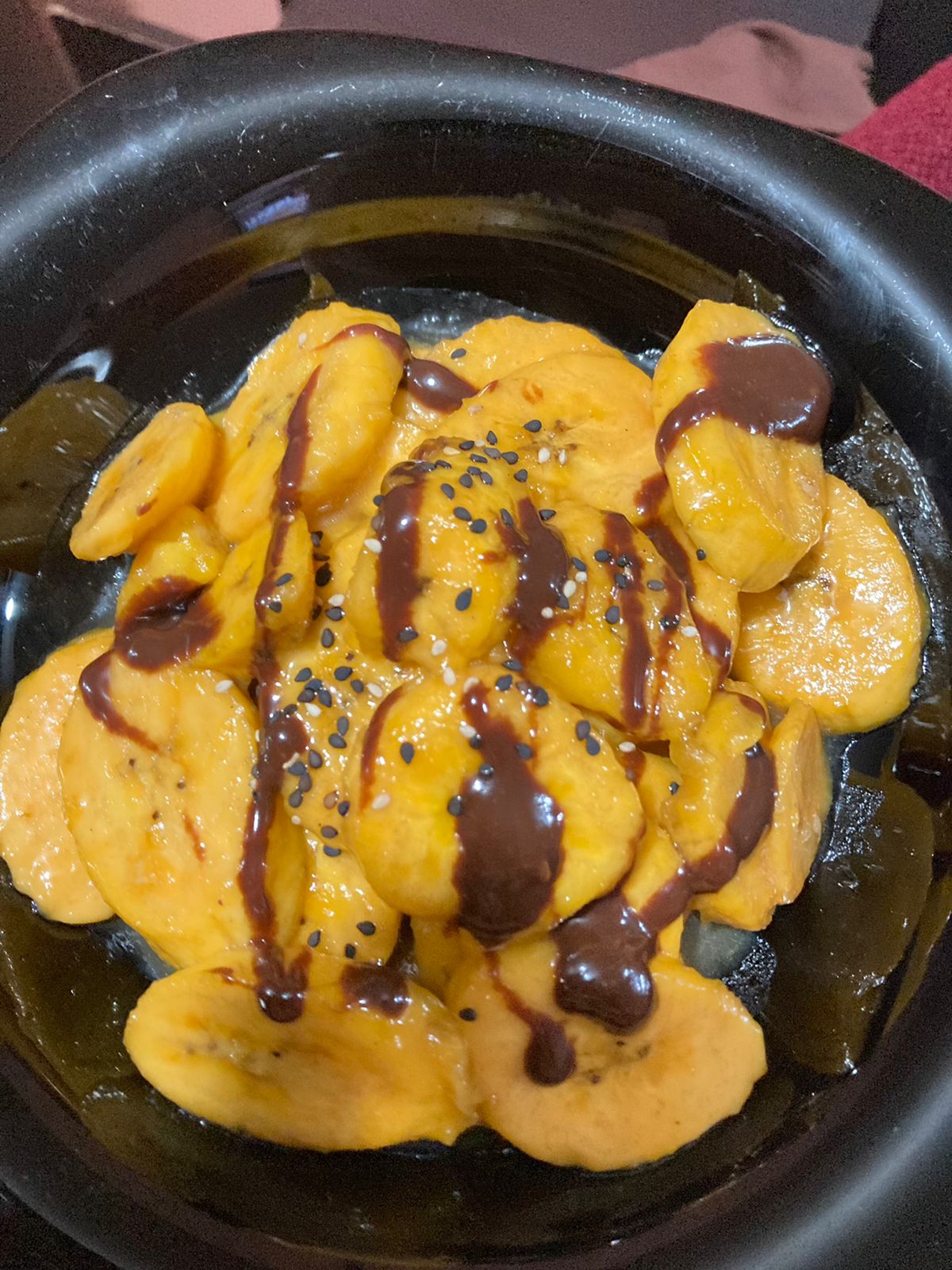 Platano en tempura dulce y fritos, decorados con salsa de chocolate