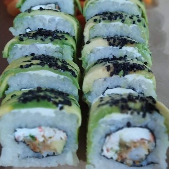 Camarón empanizado y tampico (dentro) ajonjolí y aguacate (fuera)todos nuestros rollos llevan por dentro zanahoria, pepino, queso crema y aguacate.