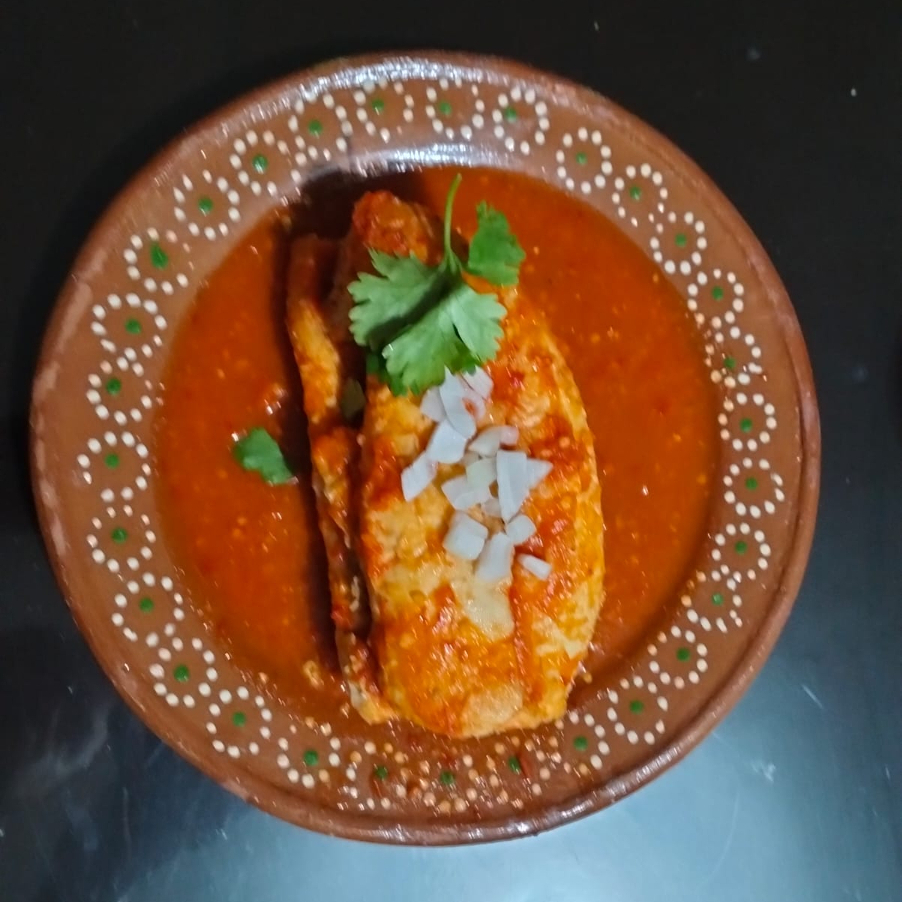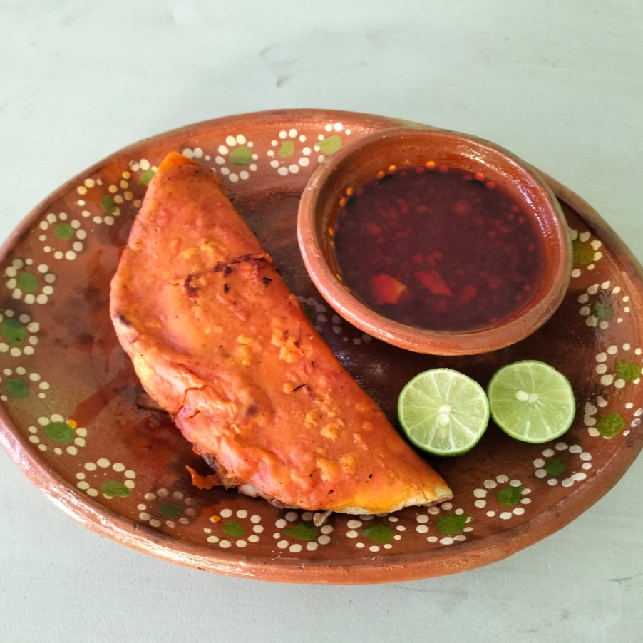 tortilla de tamaño grande adobada y dorada con consome acompañado de un rico consome