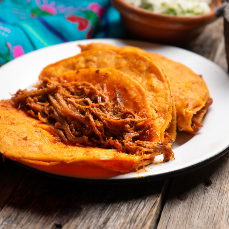 orden de 4 tacos de birria con tortilla doble adobada a la plancha. Acompañado por aparte con cilantro, cebolla, limon y salsa