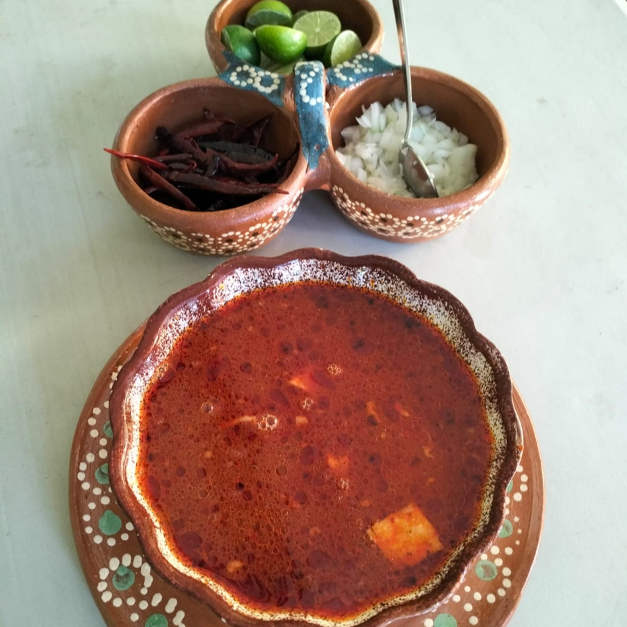 Menudo tradicional para una persona con 200 g de carne, servido de bote de 1 litro. Acompañado por aparte con cebolla, chiles de arbol y limon.