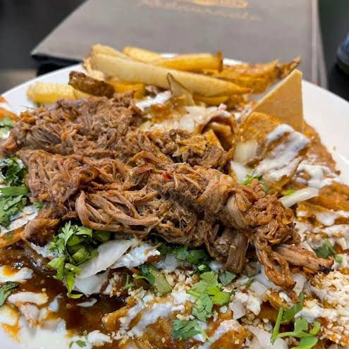 Ricos chilaquiles de birria bañados en una rica salsa roja y coronado con cilantro, cebolla queso y crema, lleva 100g de totopos y 60g de birria