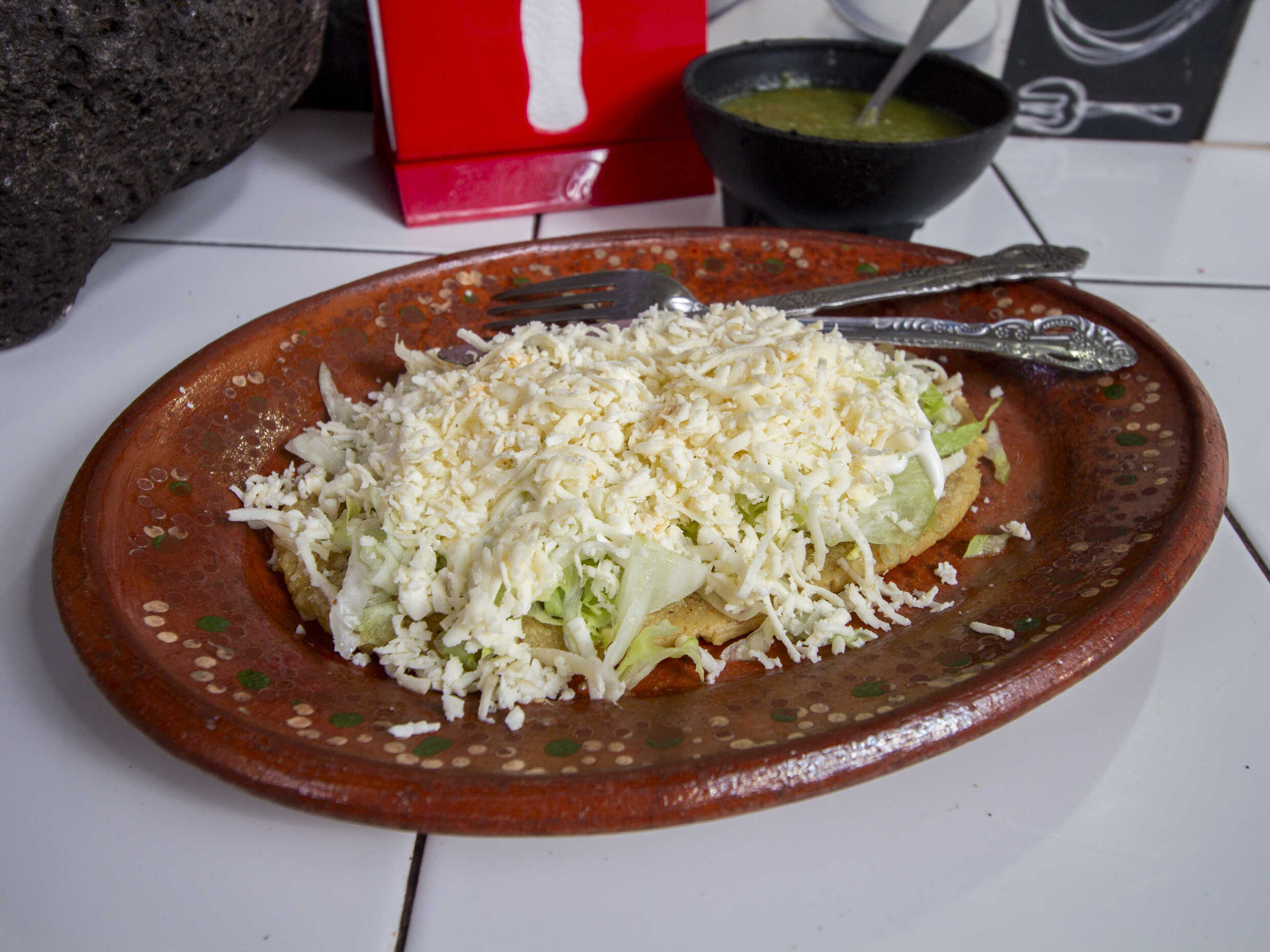 Tortilla pellizcada dorada con manteca de cerdo una base de queso asadero y guisado a su elección.