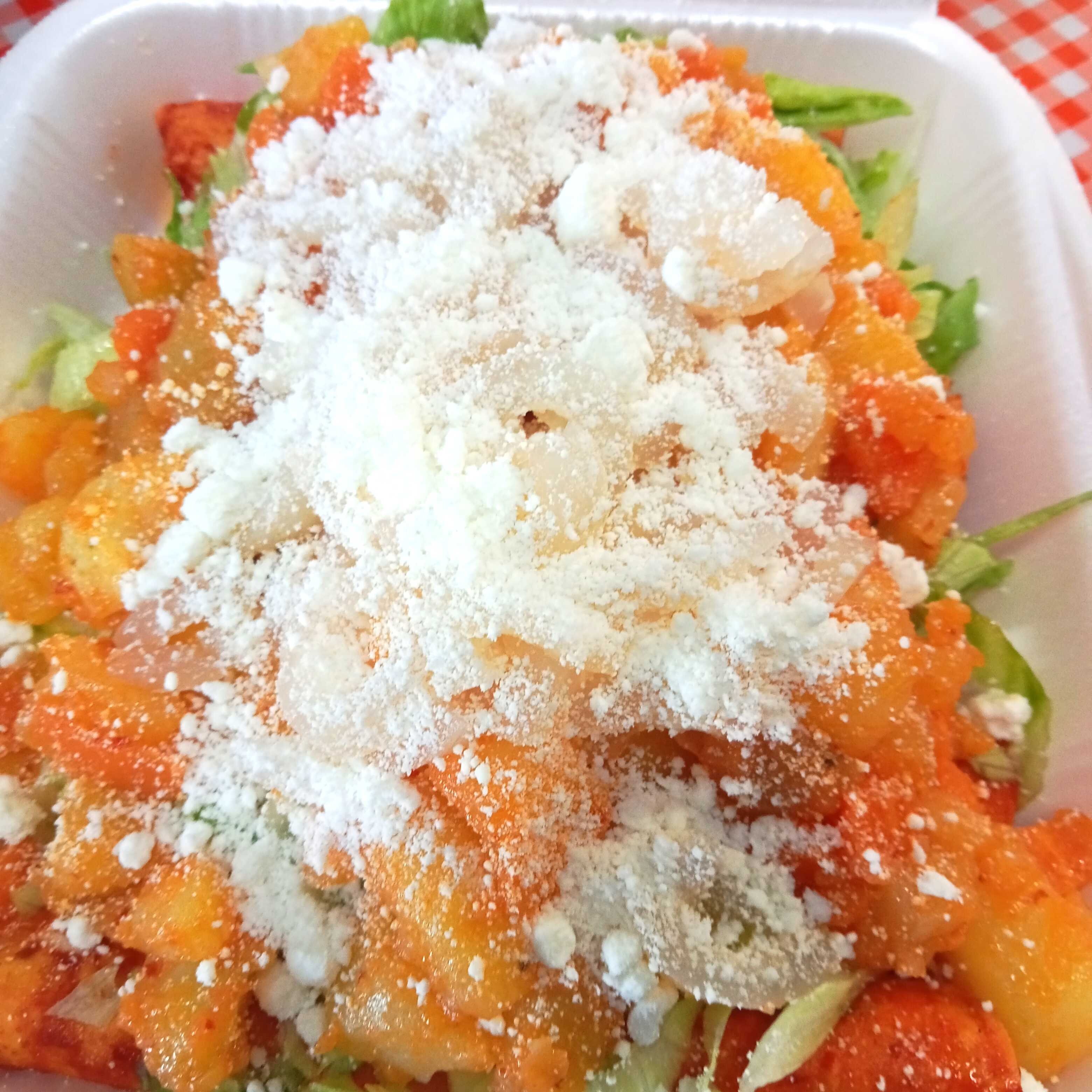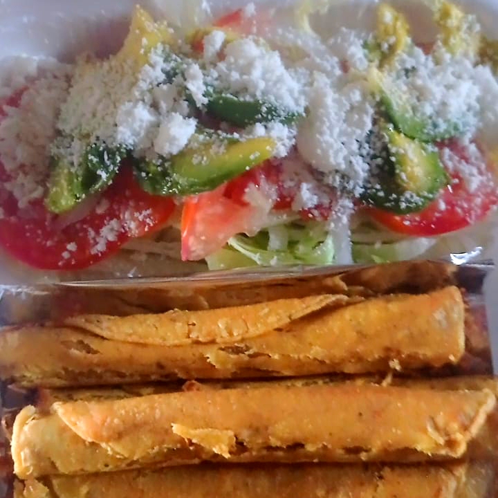 Flautas de res, contiene, lechuga, tomate, cebolla, aguacate,cueritos, queso, crema, y salsa