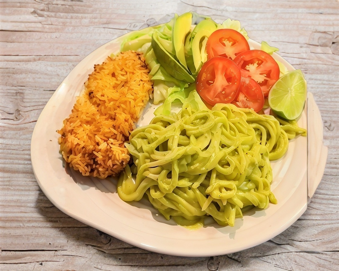 Spaguetti verde ó Arroz, ensalada de lechuga, jitomate. limon, salsa y tortilla