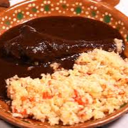Carne de puerco en salsa con arroz, Frijoles y tortillas