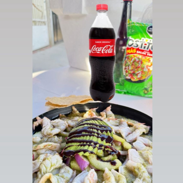 350 gr de camaron fresco bañados en salsa de la casa con cebolla morada, pepino e ingredientes de la casa