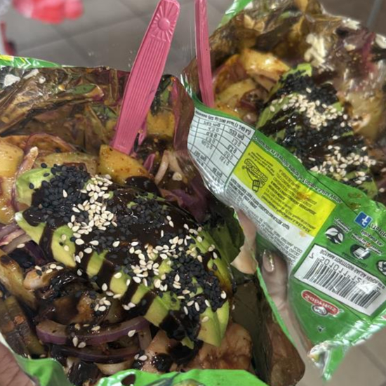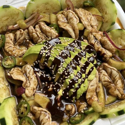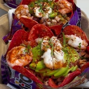 250 Gr de Camaron bañados en salsa de la casa acompañados de cebolla morada, pepino e ingredientes de la casa.