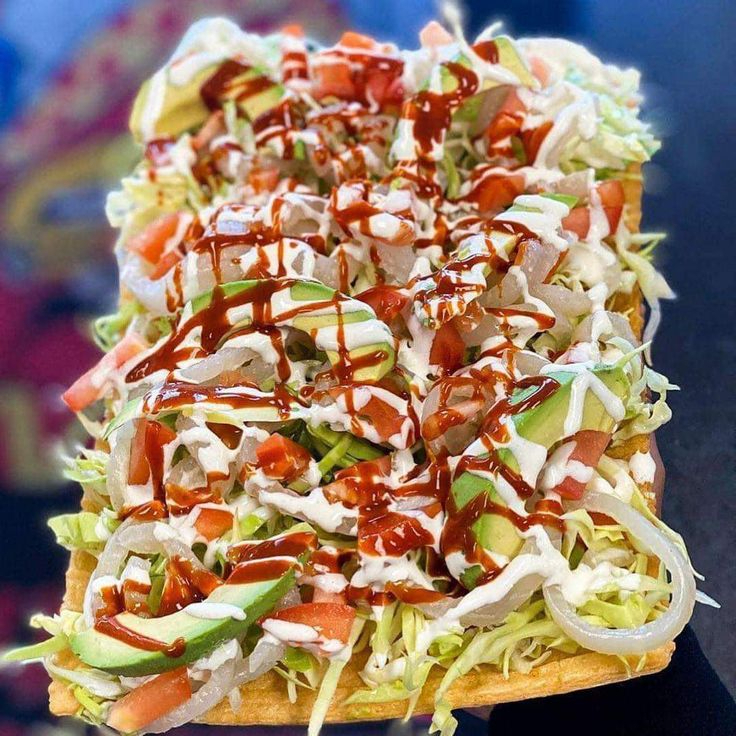 Tostadas preparadas con verdura, aguacate, salsa casera, crema, salsa roja