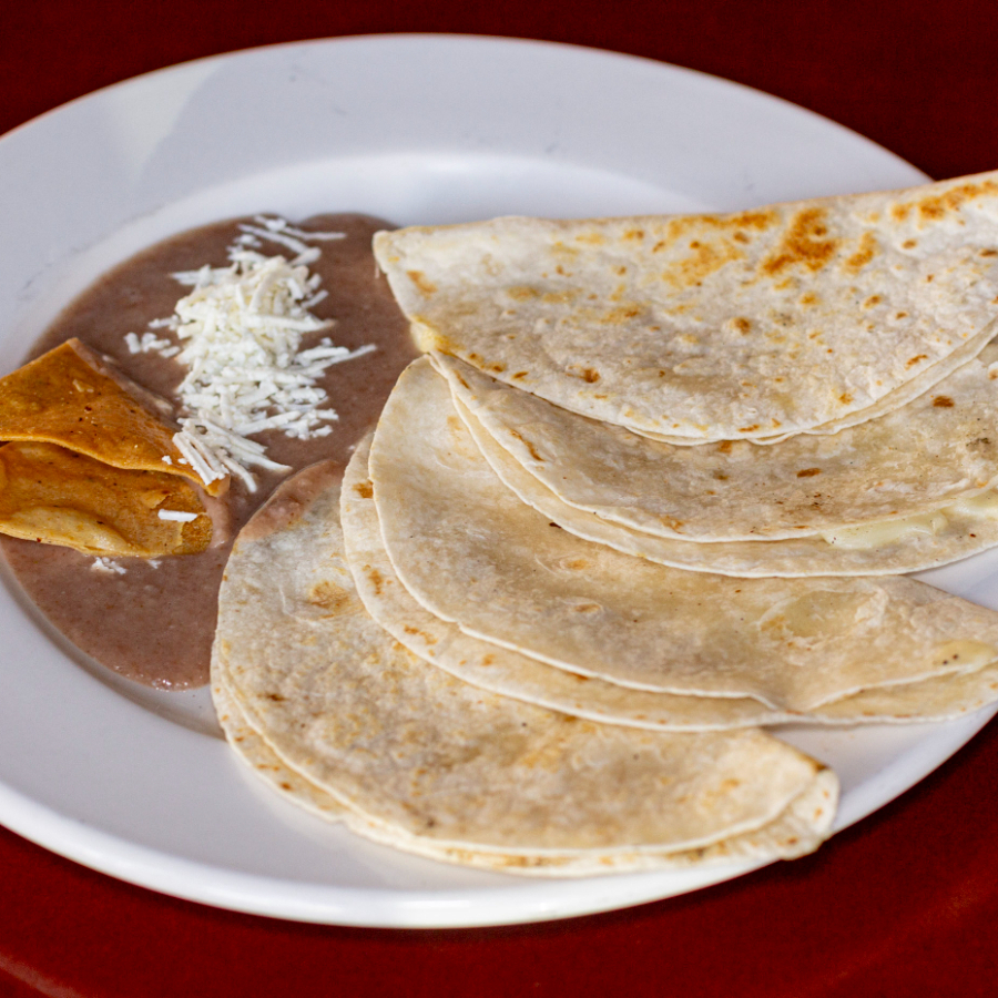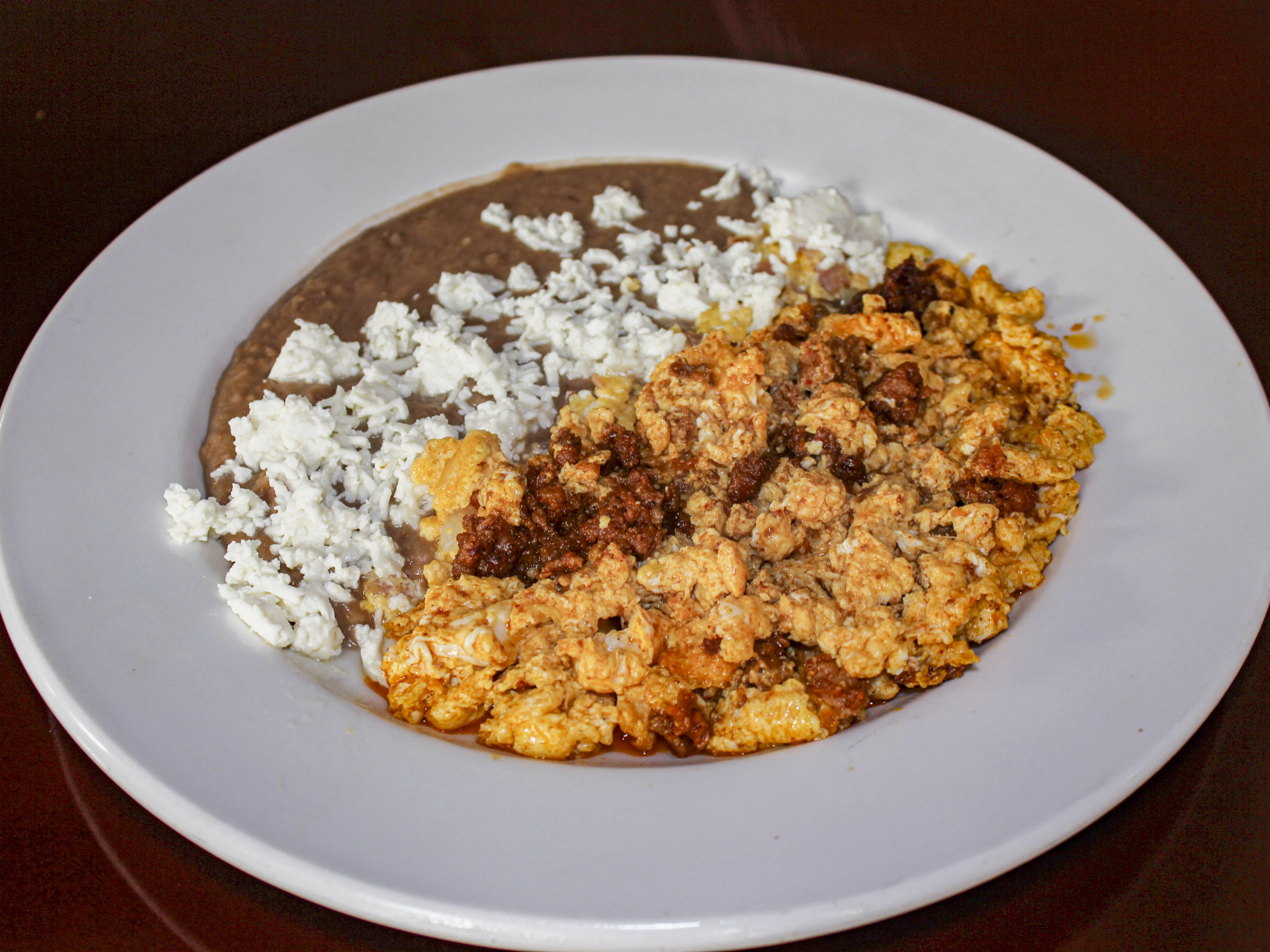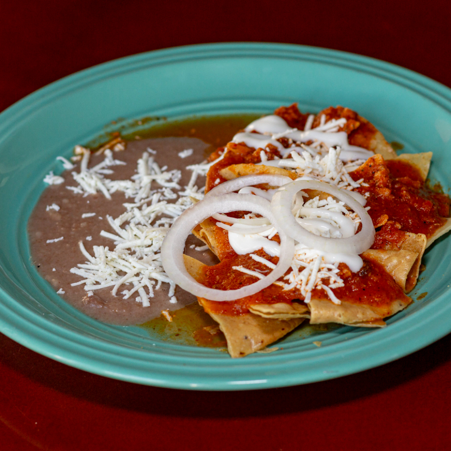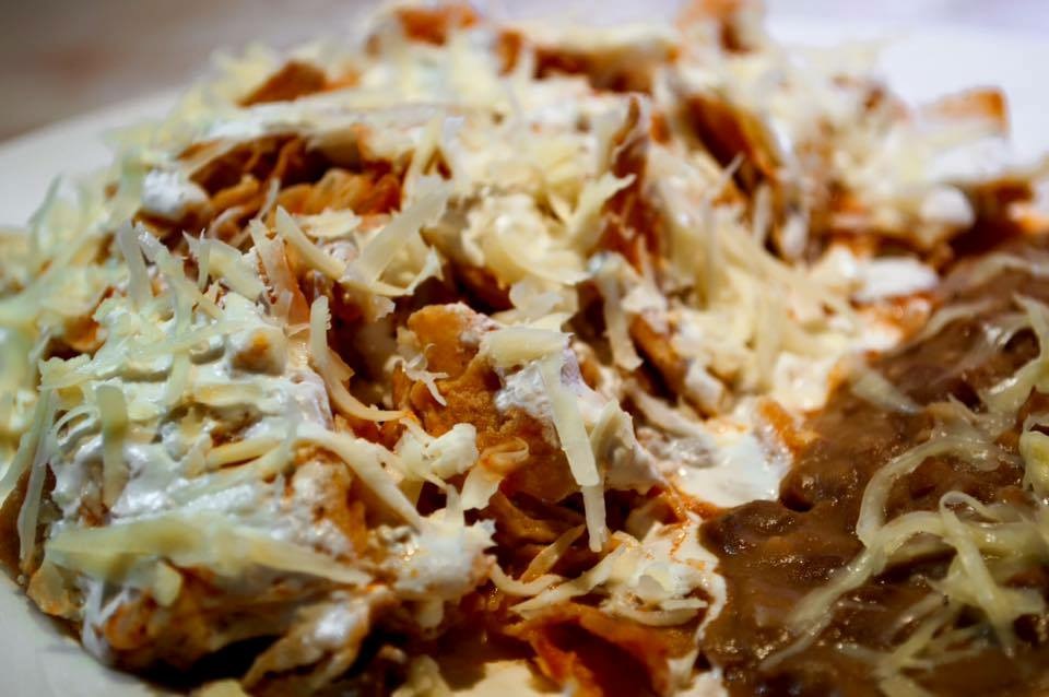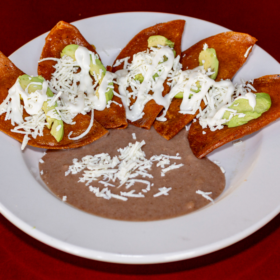 Totopos bañados en salsa de Chorizo, cubiertos de queso fresco rallado y crema, acompañados con frijoles refritos.