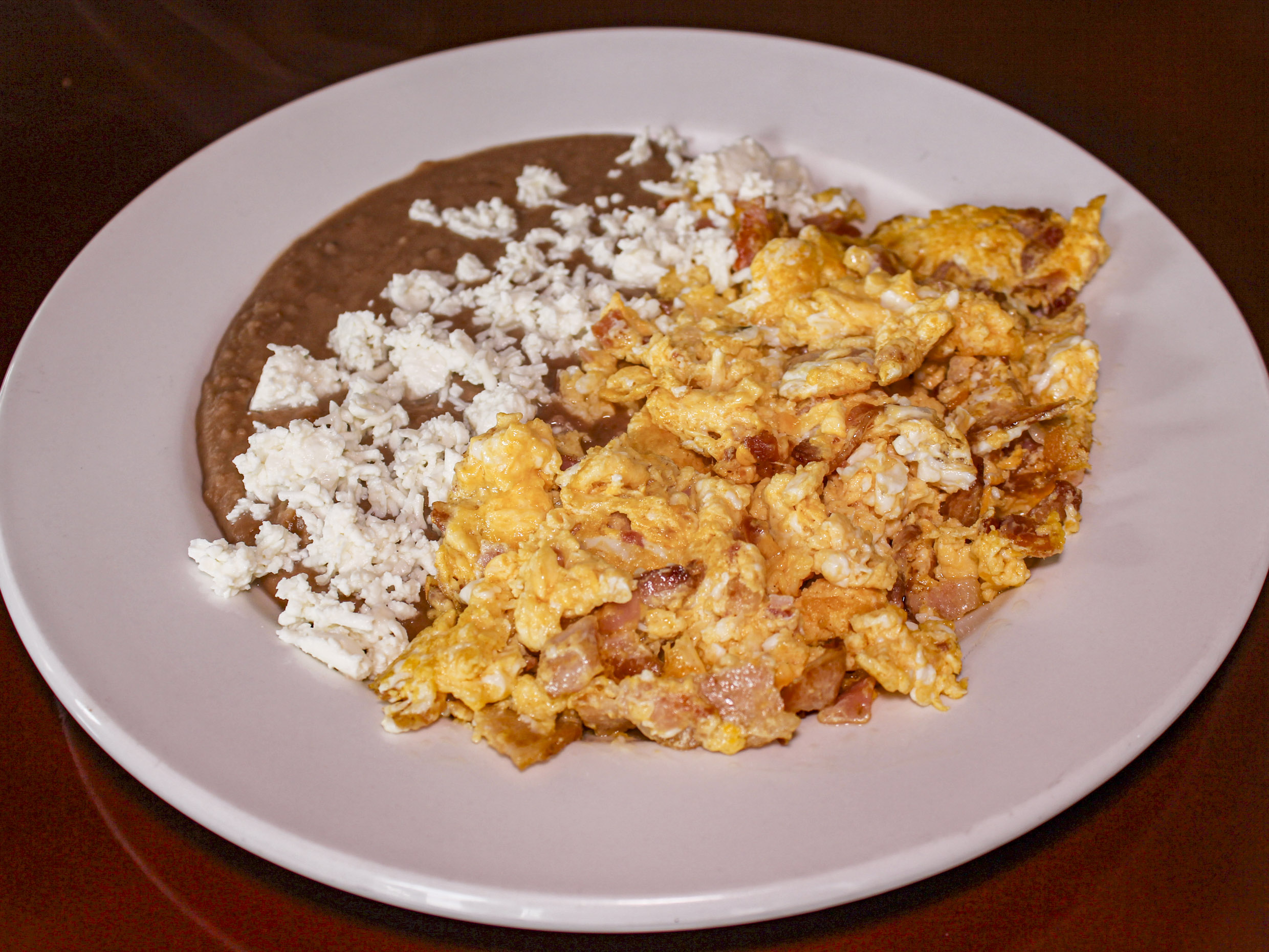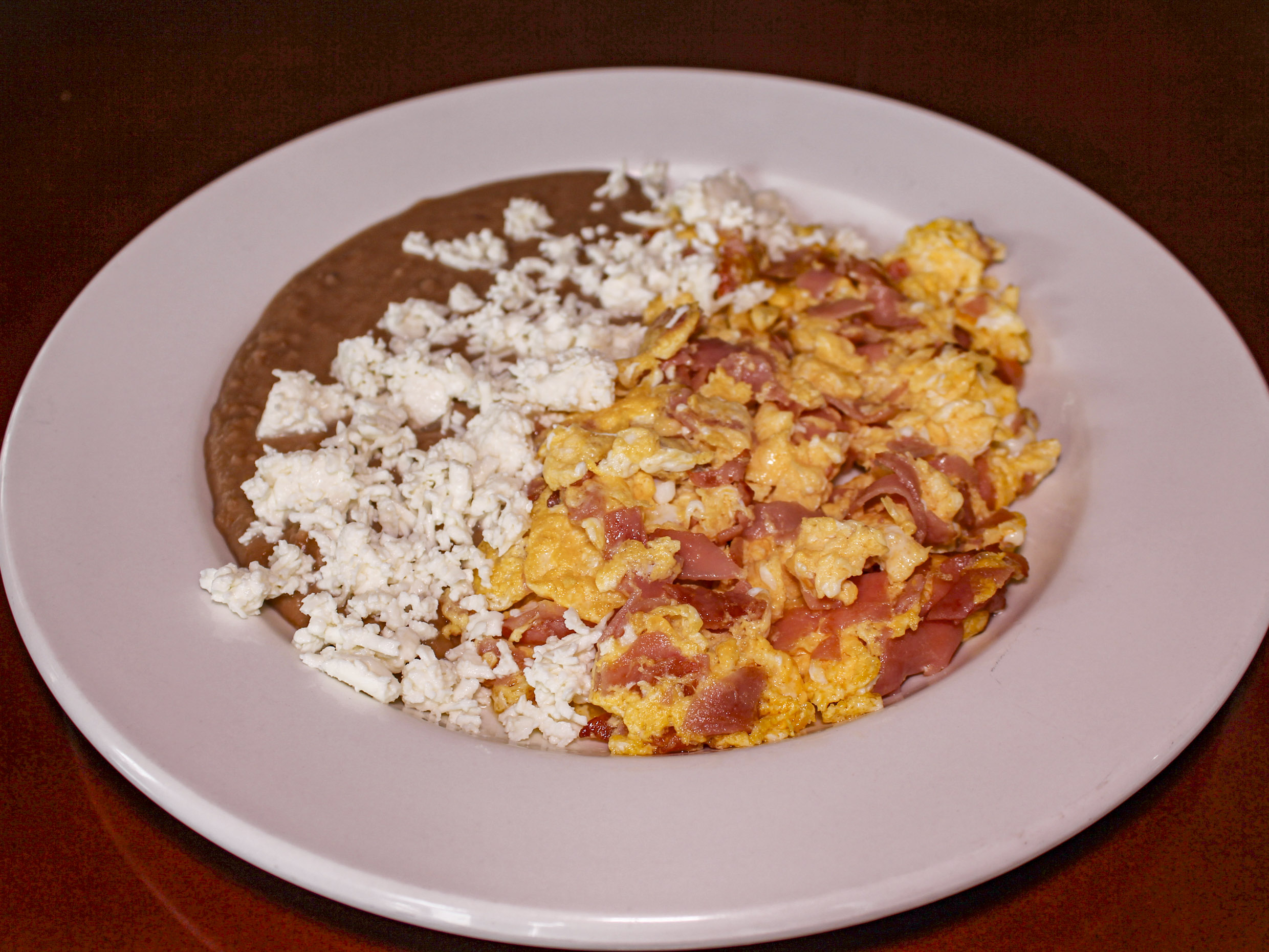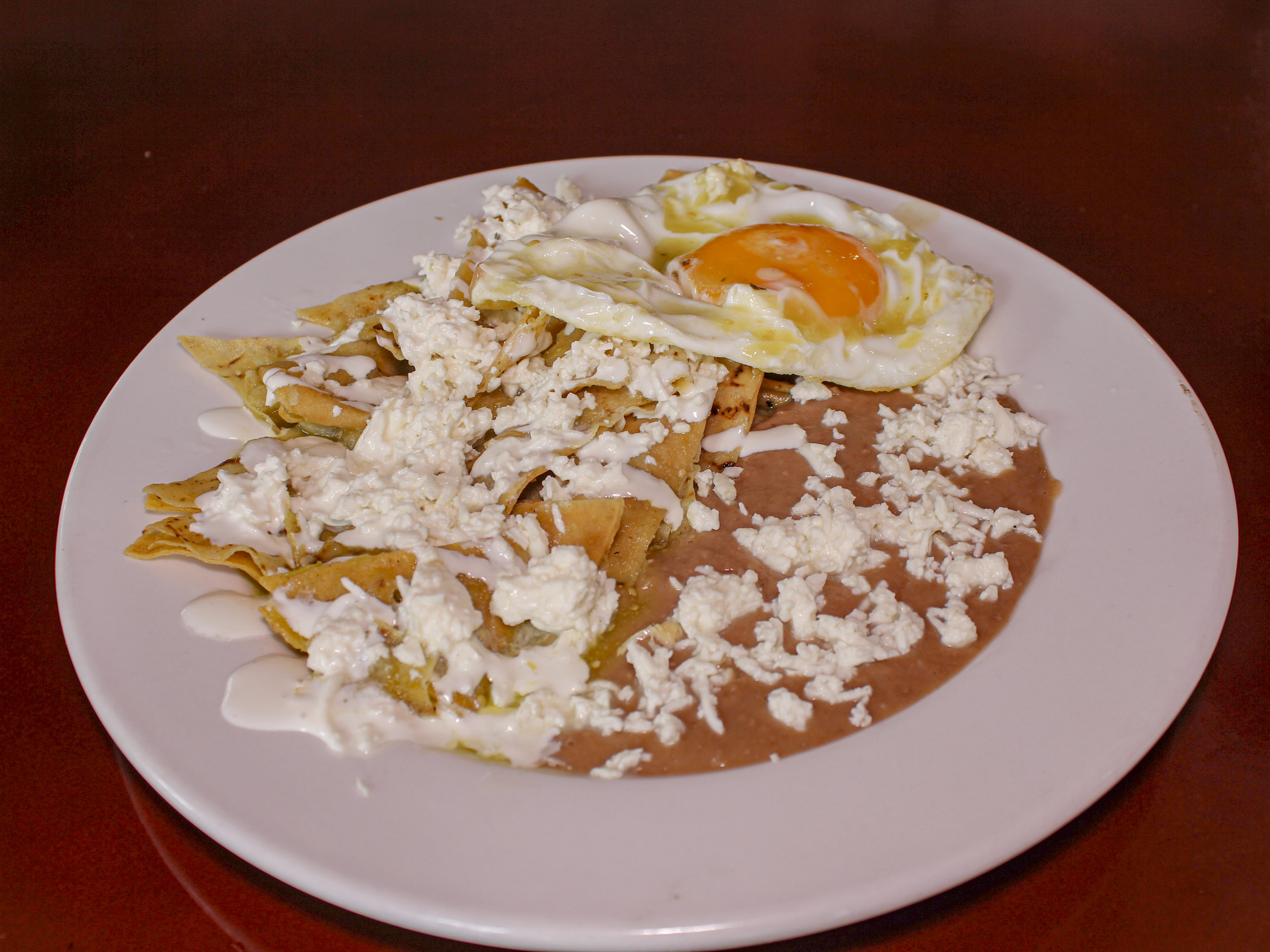 Totopos bañados en salsa de su elección, con Huevo, cubiertos de queso fresco rallado y crema, acompañados con frijoles refritos, salsa verde o roja. Plato personal